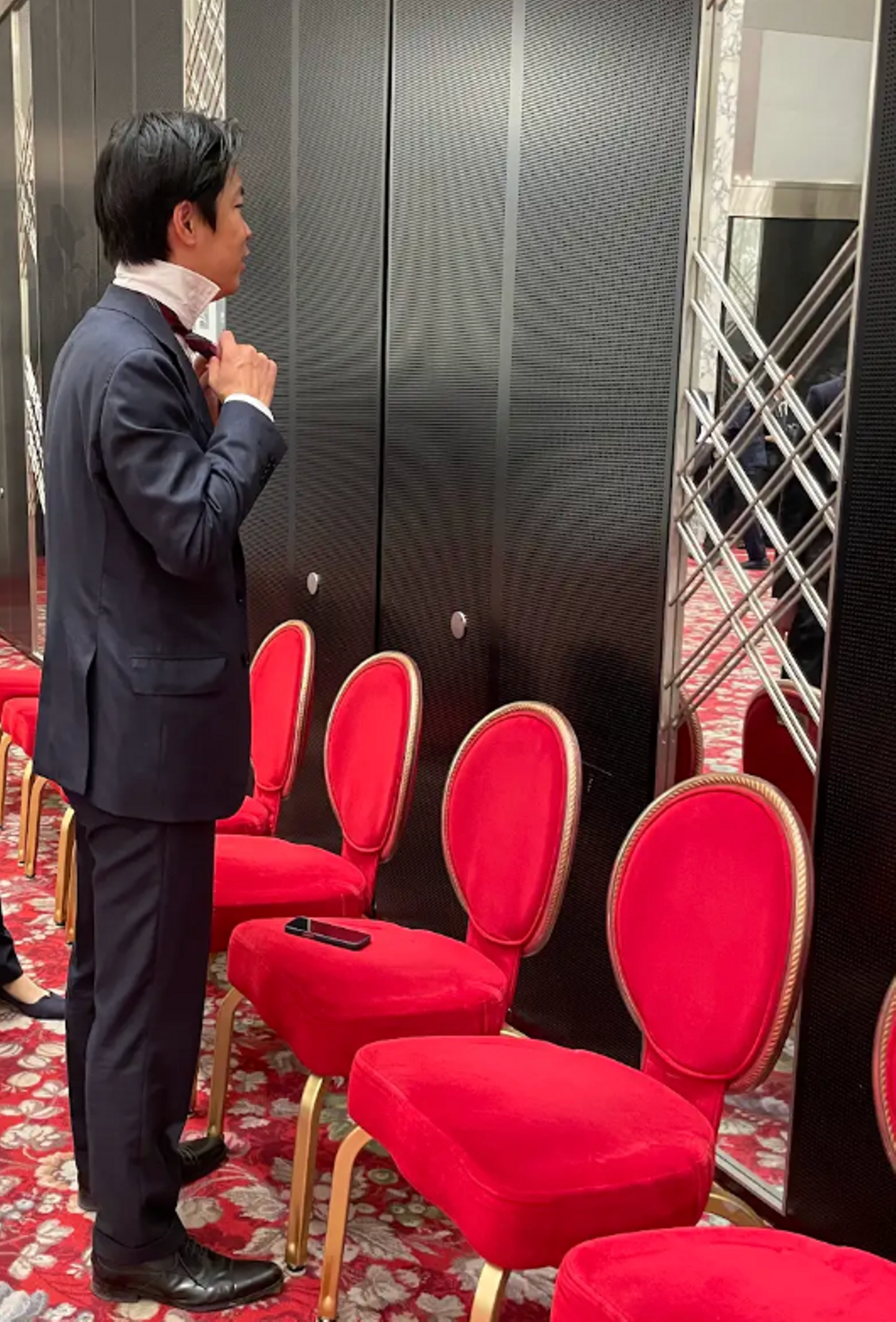身だしなみを最終チェックする代表取締役水野さん。