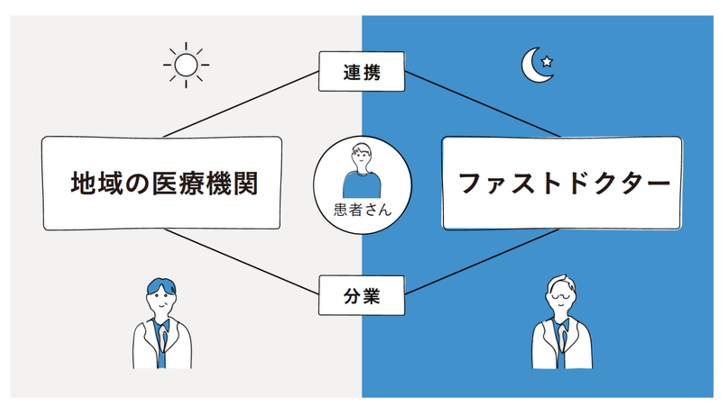わかりやすく言えば、かかりつけ医を中心とした地域の医療機関等が連携して、患者さんへ最善の医療が継続されるよう体制構築をしていこう。というものです。ファストドクターは、夜間・休日帯の、通院の難しい患者さんたちからの救急ニーズに応えながら、かかりつけ医と連携していくことにより、かかりつけ医機能を高めていくことの一端を担うことができればと考えています。