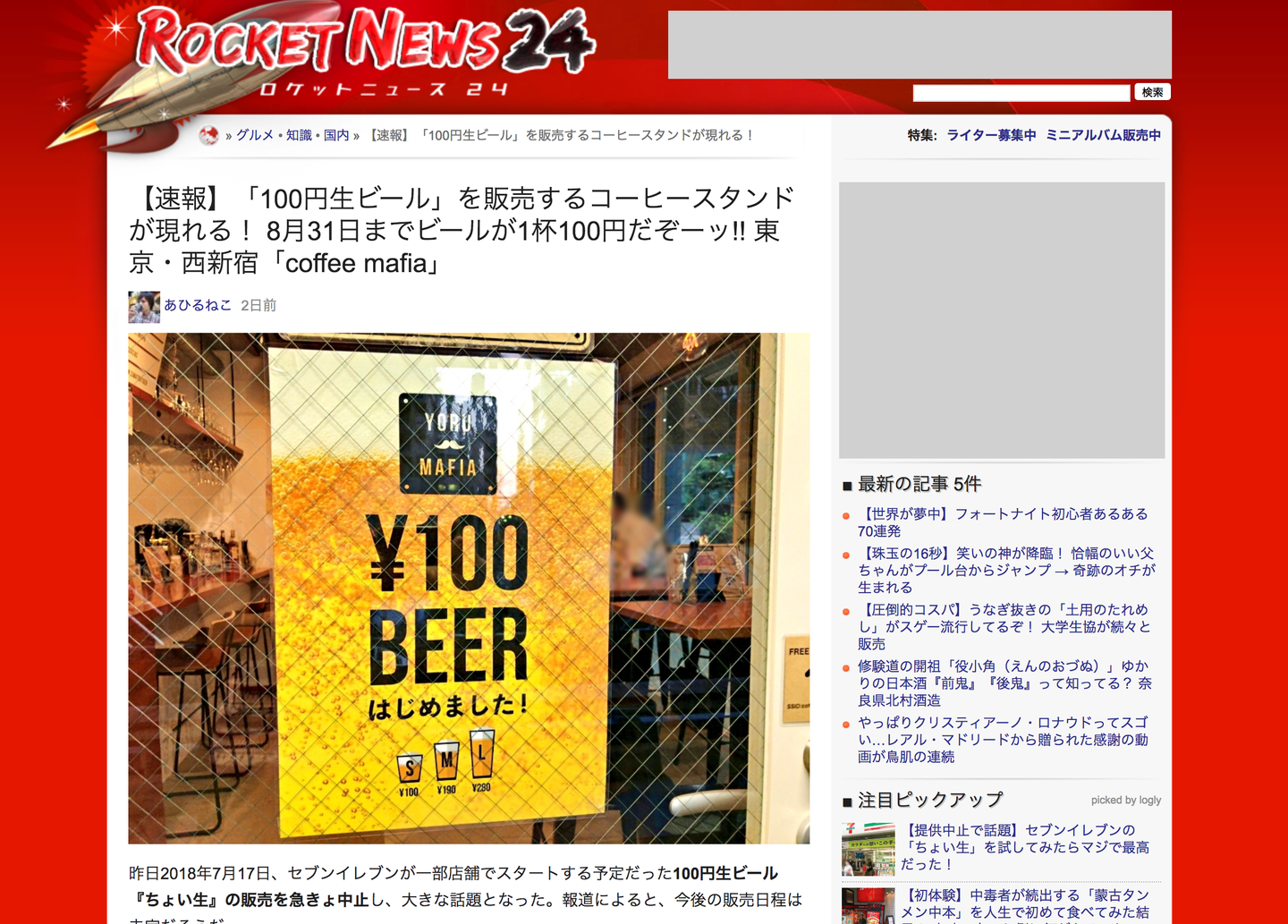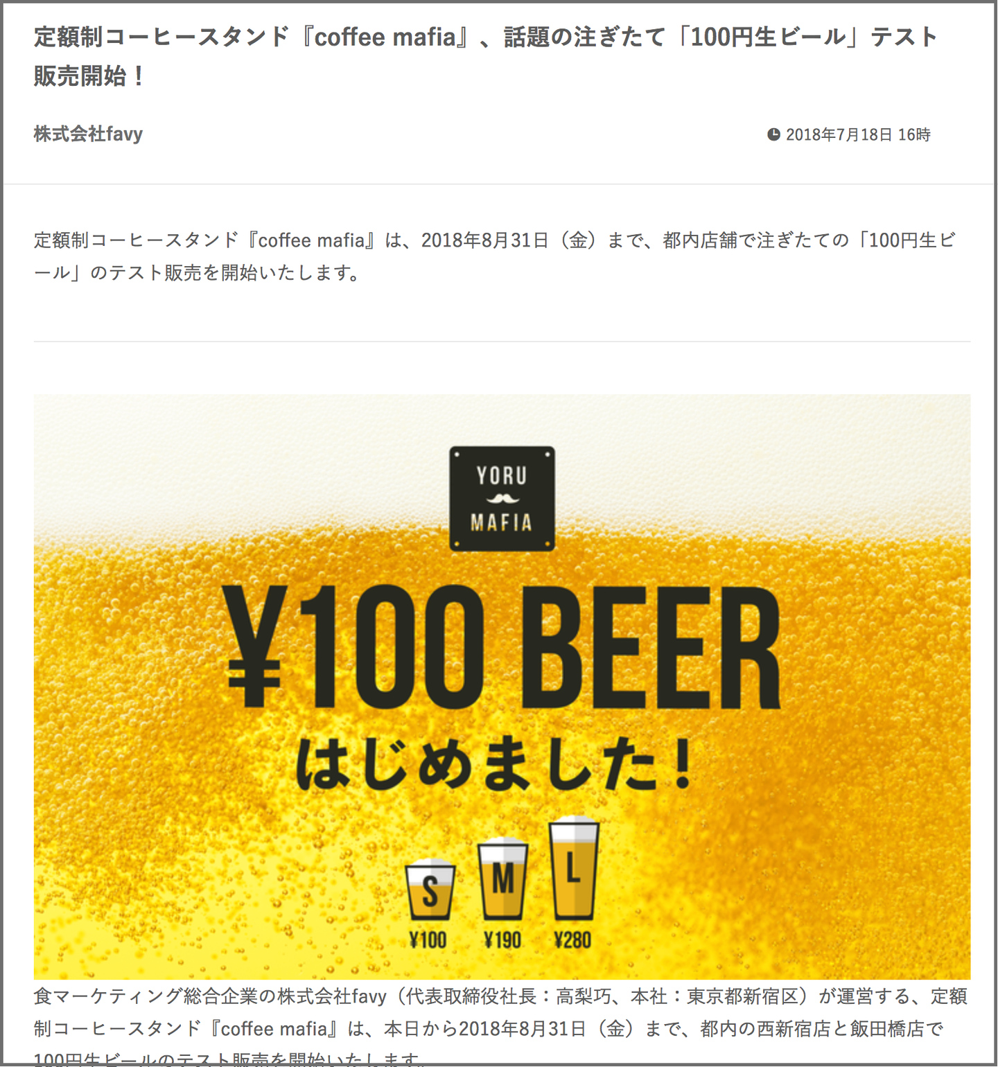 引用元:【速報】「100円生ビール」を販売するコーヒースタンドが現れる! 8月31日までビールが1杯100円だぞーッ!! 東京・西新宿「coffee mafia」