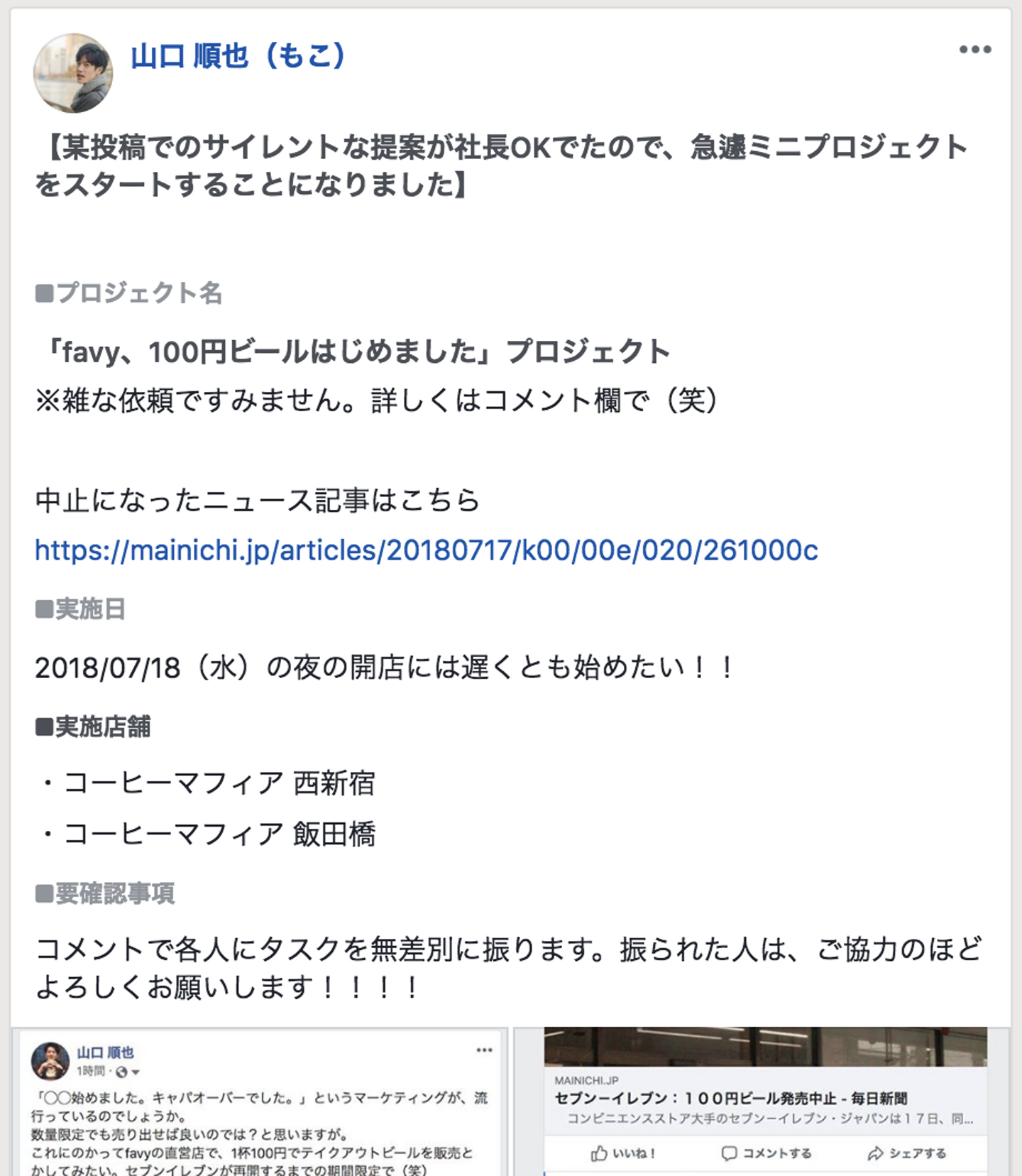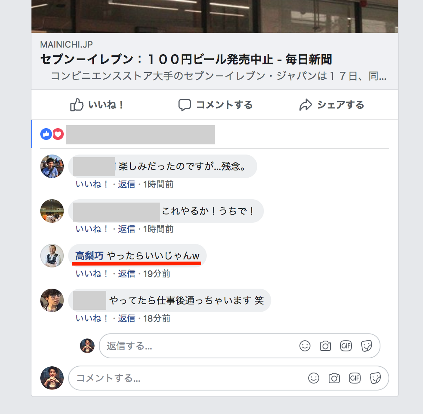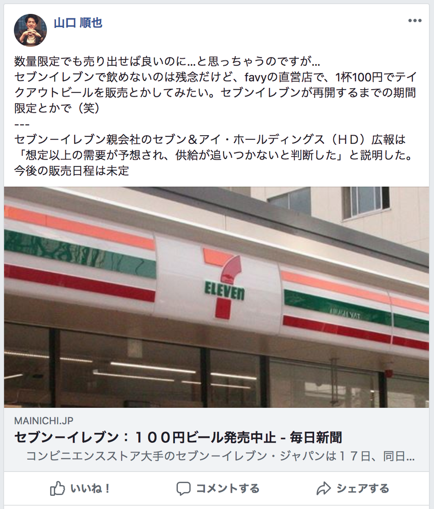 落胆しながら、軽い気持ちでFacebookに「favyの直営店で、1杯100円でテイクアウトビールを販売とかしてみたい。セブンイレブンが再開するまでの期間限定で(笑)」と書いた投稿に対してのfavy社長の高梨からのコメントがこちら↓