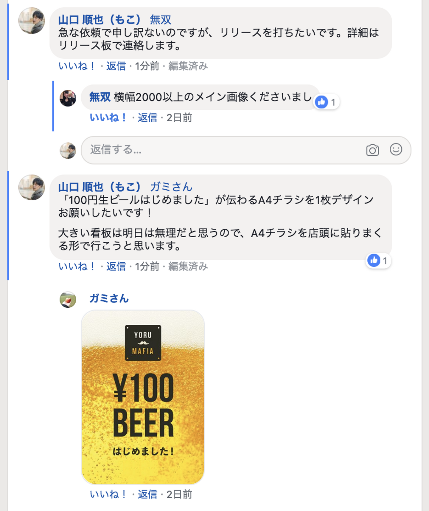 「困ったときはお互い様」「持ちつ持たれつ」「私のプロジェクトは、みんなのプロジェクト」と、自分に言い聞かせて、即座に「直営店の飲食店メンバー」「広報」「デザイナー」「その他、愉快な仲間たち」などに100円生ビールのプロジェクトがスタートしたことを報告しました。