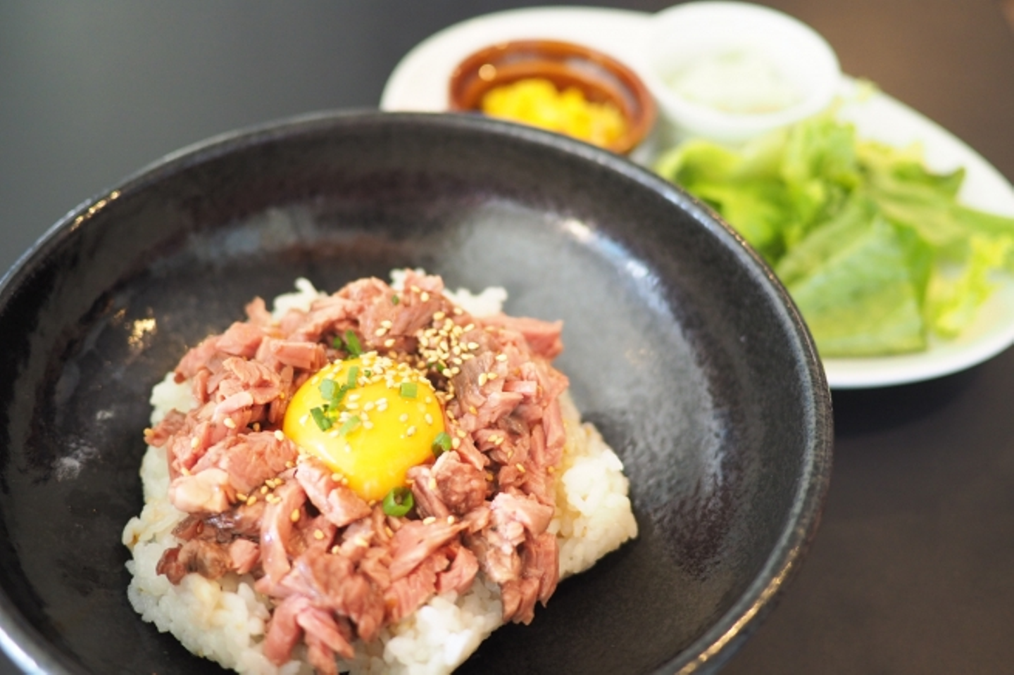 「ごま油香る柔らかユッケ丼」彩りデリ2種&グリーンサラダ