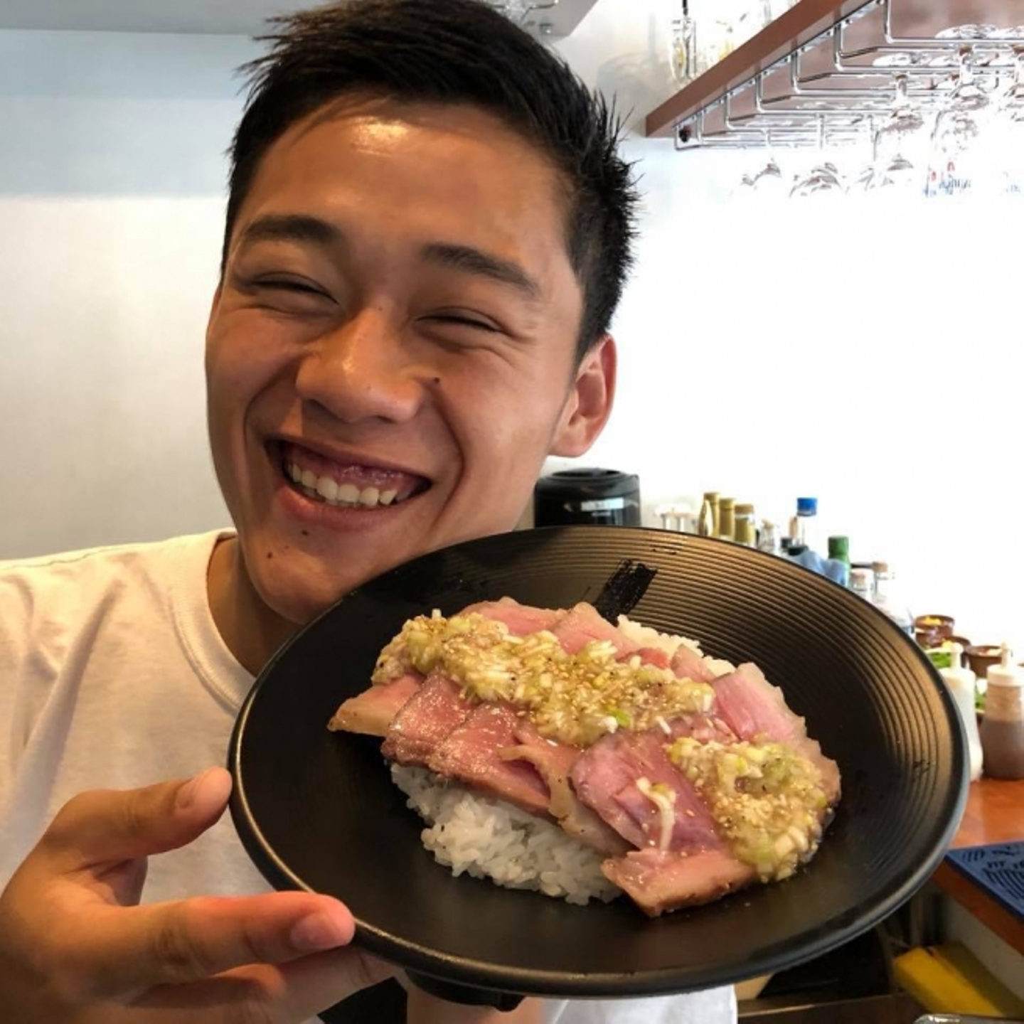社員)今食べている「ごま油香る柔らかユッケ丼」です。すっごく美味しいですよ。