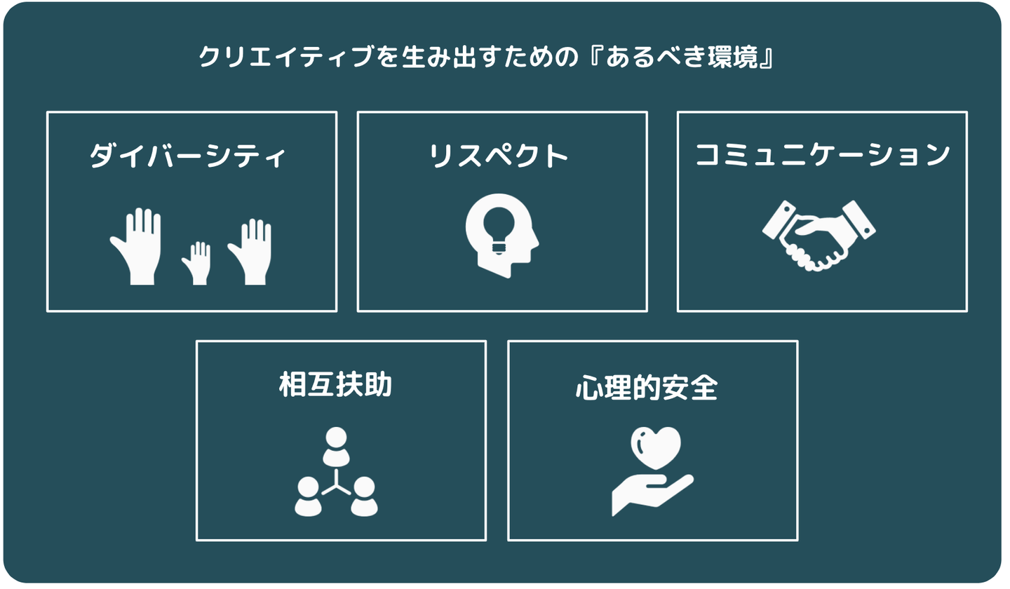 このようなクリエイティブを生み出すための『あるべき環境』を考えるにあたって、以下の5つを重視しました。