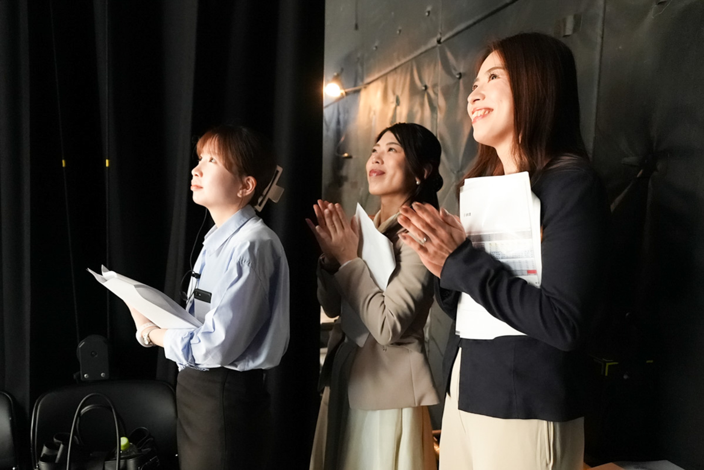 新卒選考に関わってきた人事部、今回はじめて入社式のPLをつとめた総務部メンバーを筆頭に、この瞬間のために準備を重ねていた運営チーム。ランウェイを歩く35名を、ステージ袖からあたたかく見守りました。
