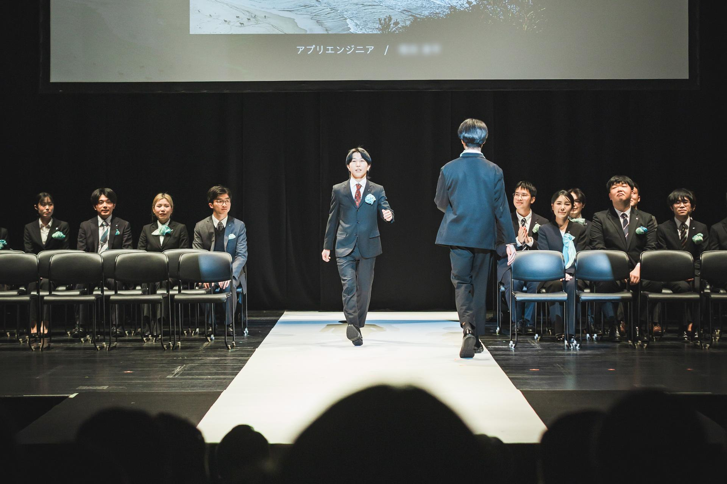 一生に一度の新卒入社式を思い出深いものにしたい。迎える先輩たちには短い時間で顔と名前を覚えてもらいたい。そんな思いから、ステージにつくった花道を“ランウェイ”のように歩いてもらう演出に。