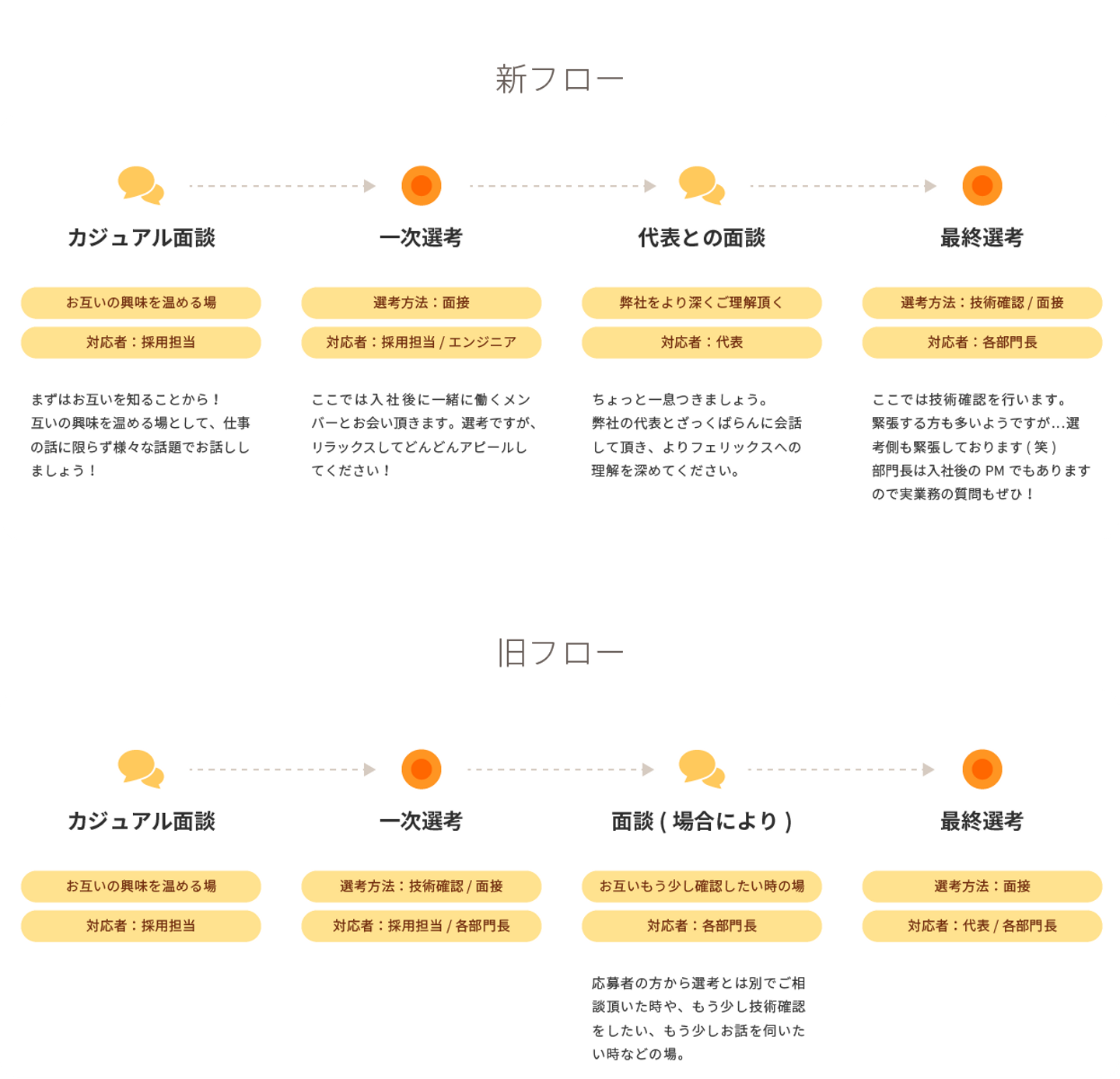 しかし、「どんな人が代表で、どんな理念を持ってその会社のトップに居るのか」というのを会社に入る前にしっかり知って貰うこと、代表と話すことで会社についての理解を深め、より納得感を持って先に進んで貰うことはとても大事ですし、フェリックスの方としても、応募者の方がリラックスした状態で代表と話して欲しいという想いがありました。そこで、一次選考と最終選考の間に代表との面談を設けました。