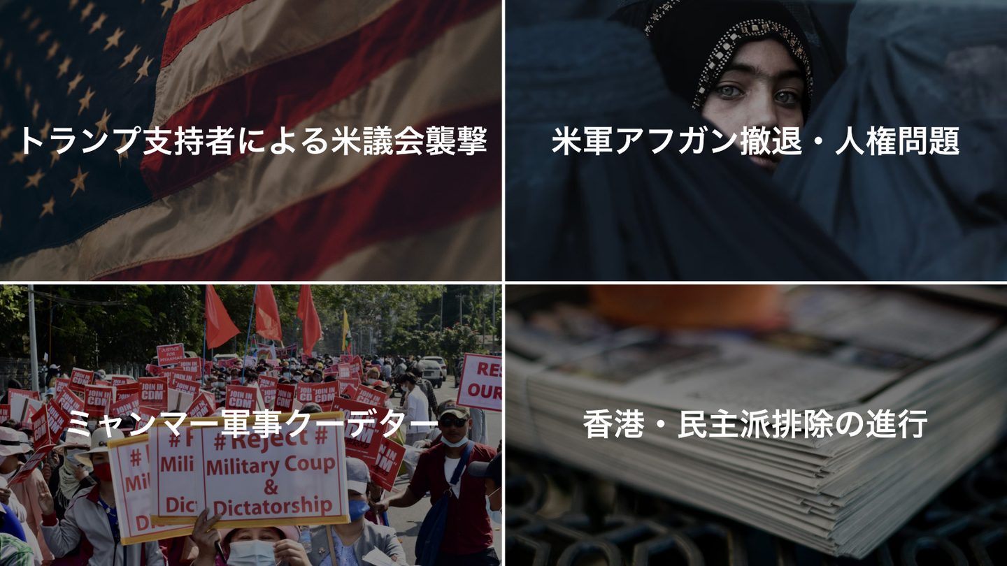2月には、ミャンマーの軍事クーデター。選挙でアウン・サン・スー・チー氏率いるNLD(国民民主連盟)が圧勝していたにも関わらず、軍事クーデターが起きミャンマー国軍が政権を掌握しました。母国の家族を心配する、在日のミャンマーの人たちも支援し続けるなど、いまだに国民が民主主義を取り戻そうと戦い続けています。