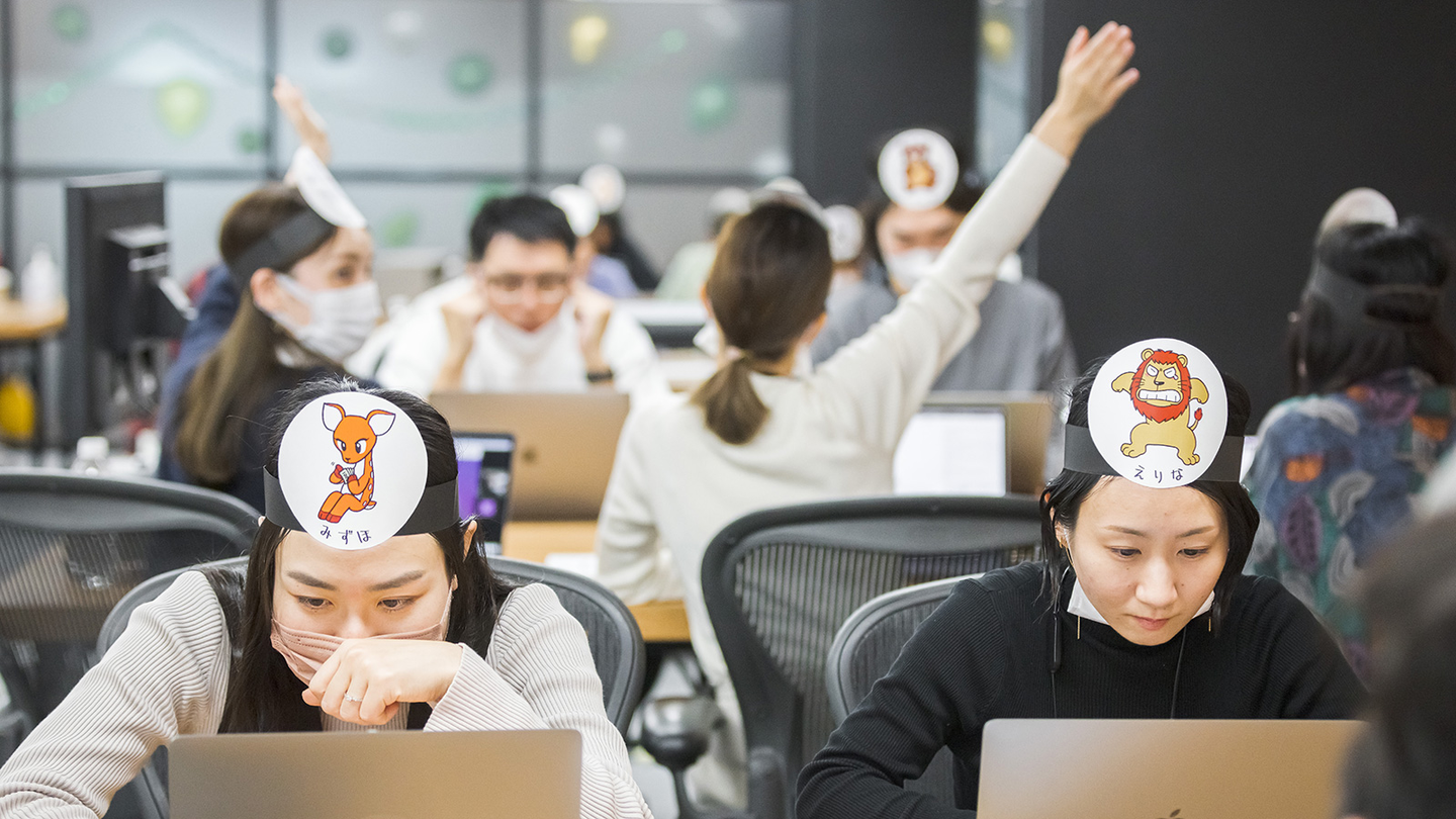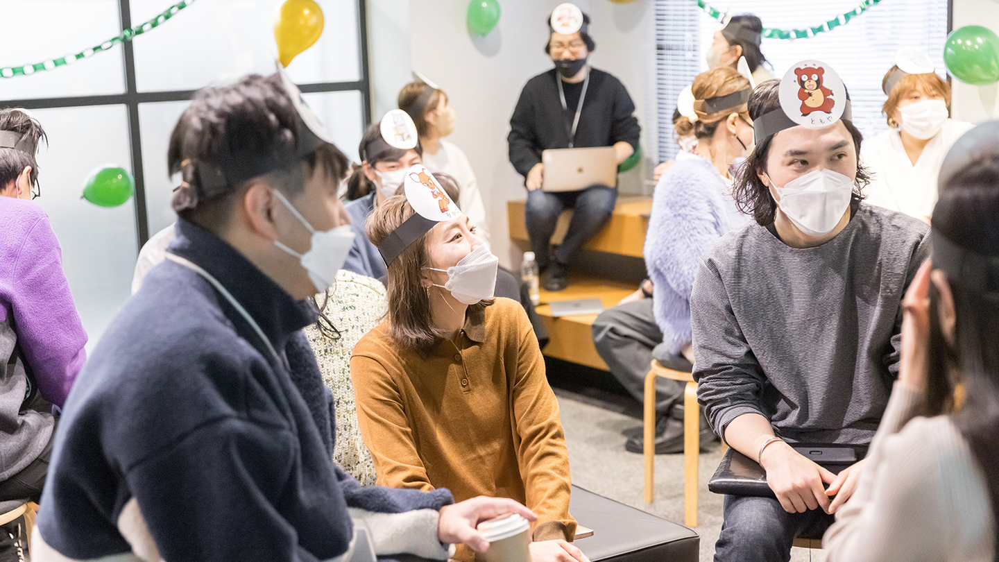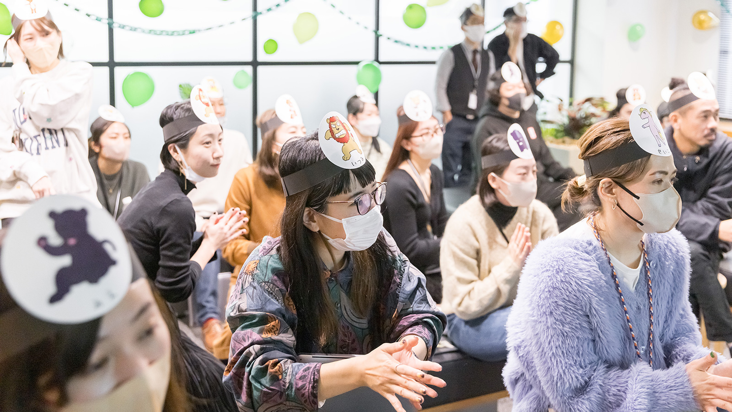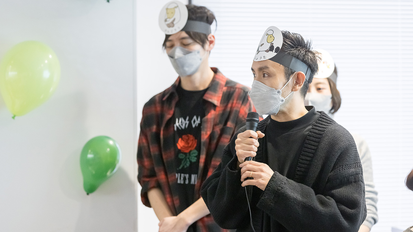 恥ずかしがる様子もなく、頭にお面をつけていくメンバーたち。スタイリッシュでかっこいい印象とはかけ離れた姿になっていきます。「なんだか意外!」「どことなく似てるね」など、お面に描かれたお互いのどうぶつを見て、自然と会話がはずみます。