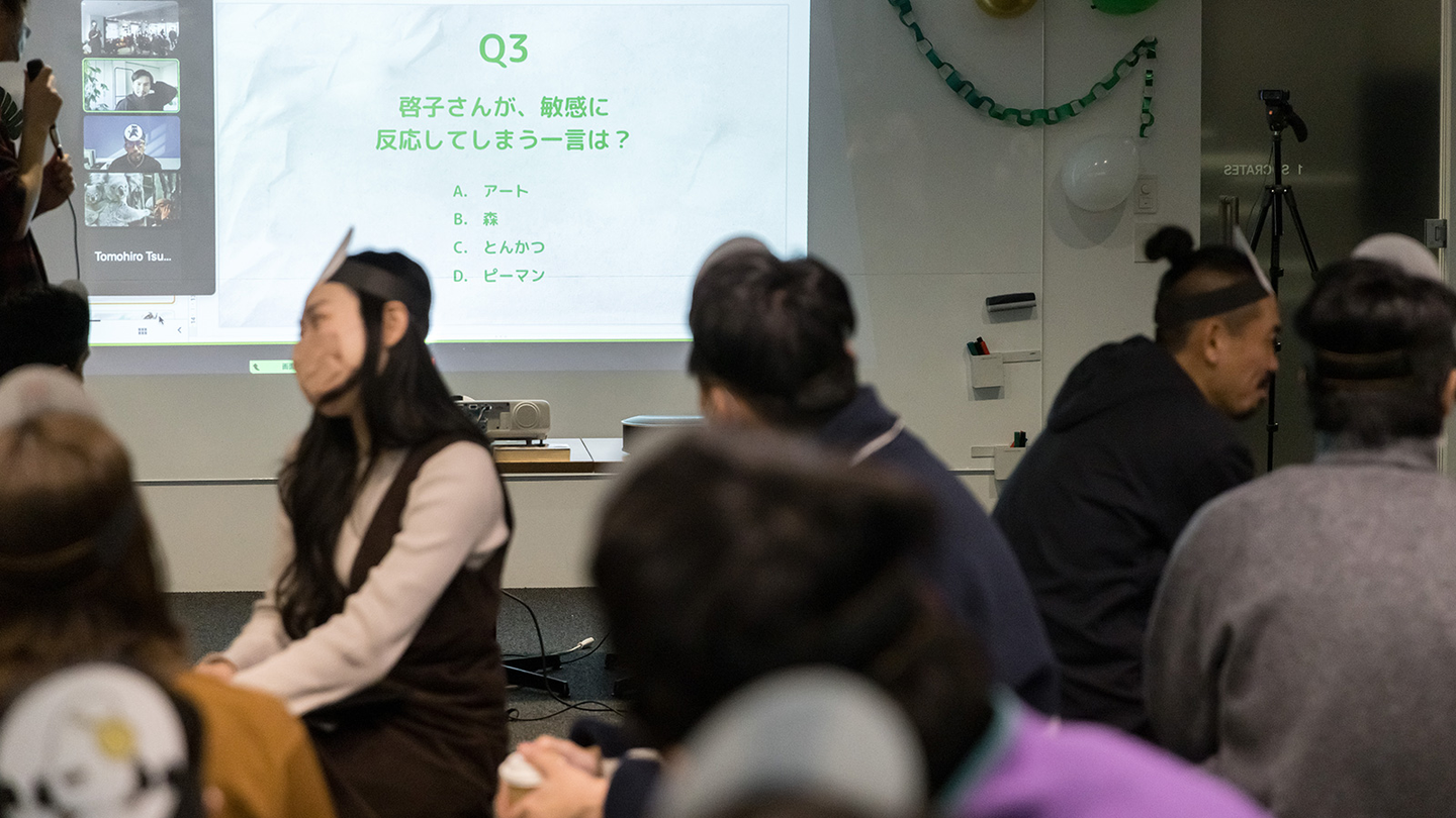 1つめのゲームは、明日には忘れてしまいそうな、誰が得をするのか分からないクイズに答えるチーム対抗戦です。事前に役員の2人に全部で8つの質問をしています。メンバーたちに普段あまり聞かれないような質問内容に、役員の2人ならどう答えるのかを想像しながら、質問の答えをチームでひとつ選択します。