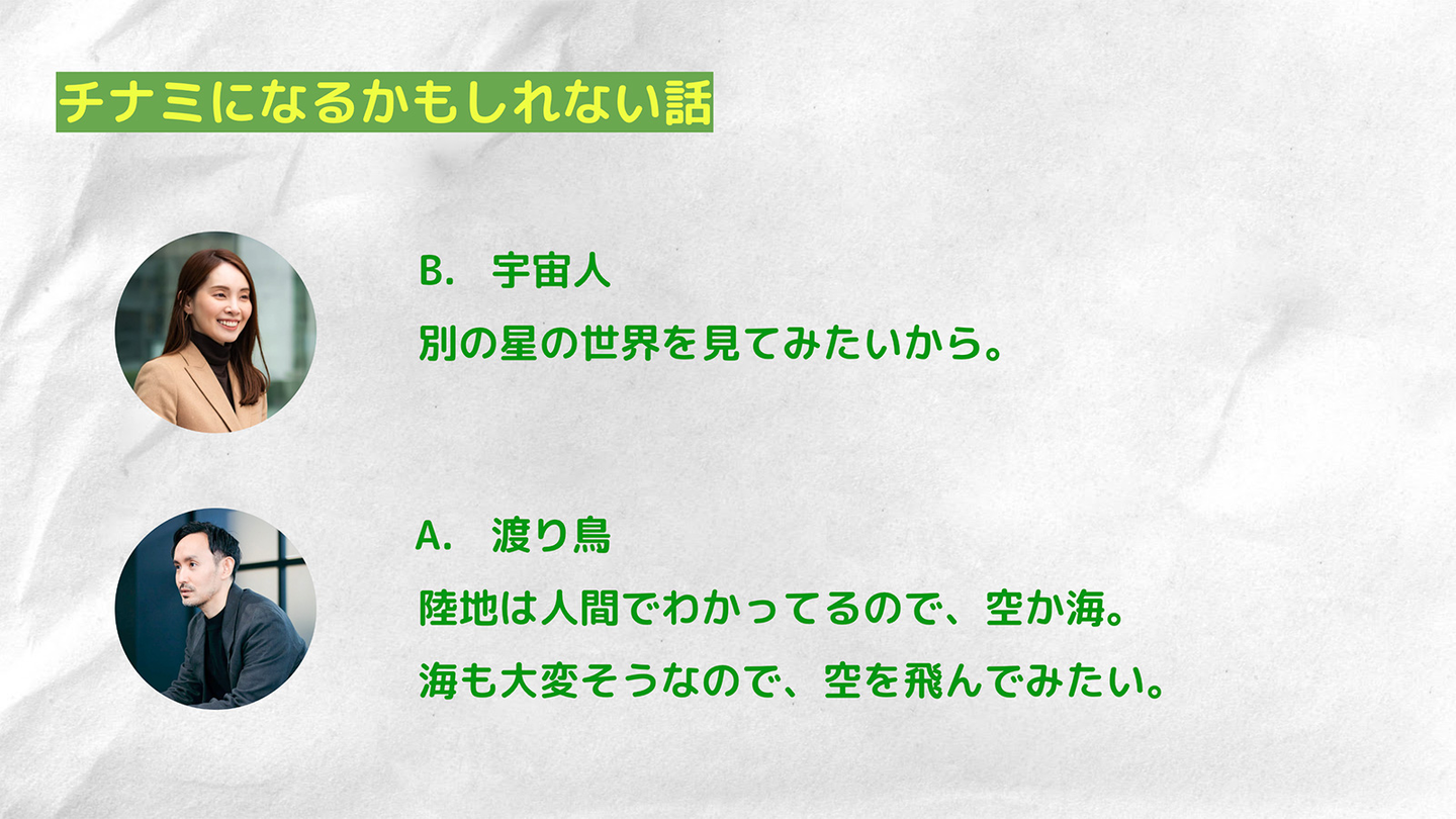 一問一答形式で正解発表の後には、「チナミになるかもしれない話」が添えられ、役員はありのままのエピソードをさらけ出していました。