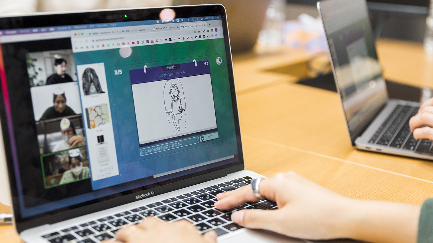 2つめのゲームは、オンラインアプリ「ガーティックフォン(Gartic Phone)」を使ったお絵かき伝言ゲームです。誰かが考えた文章のお題に、別の誰かが絵を描いて伝え、また別の誰かが絵を見て文章にして回答する。数回繰り返し、最後までうまく伝言が伝わったチームが勝利するチーム対抗戦です。