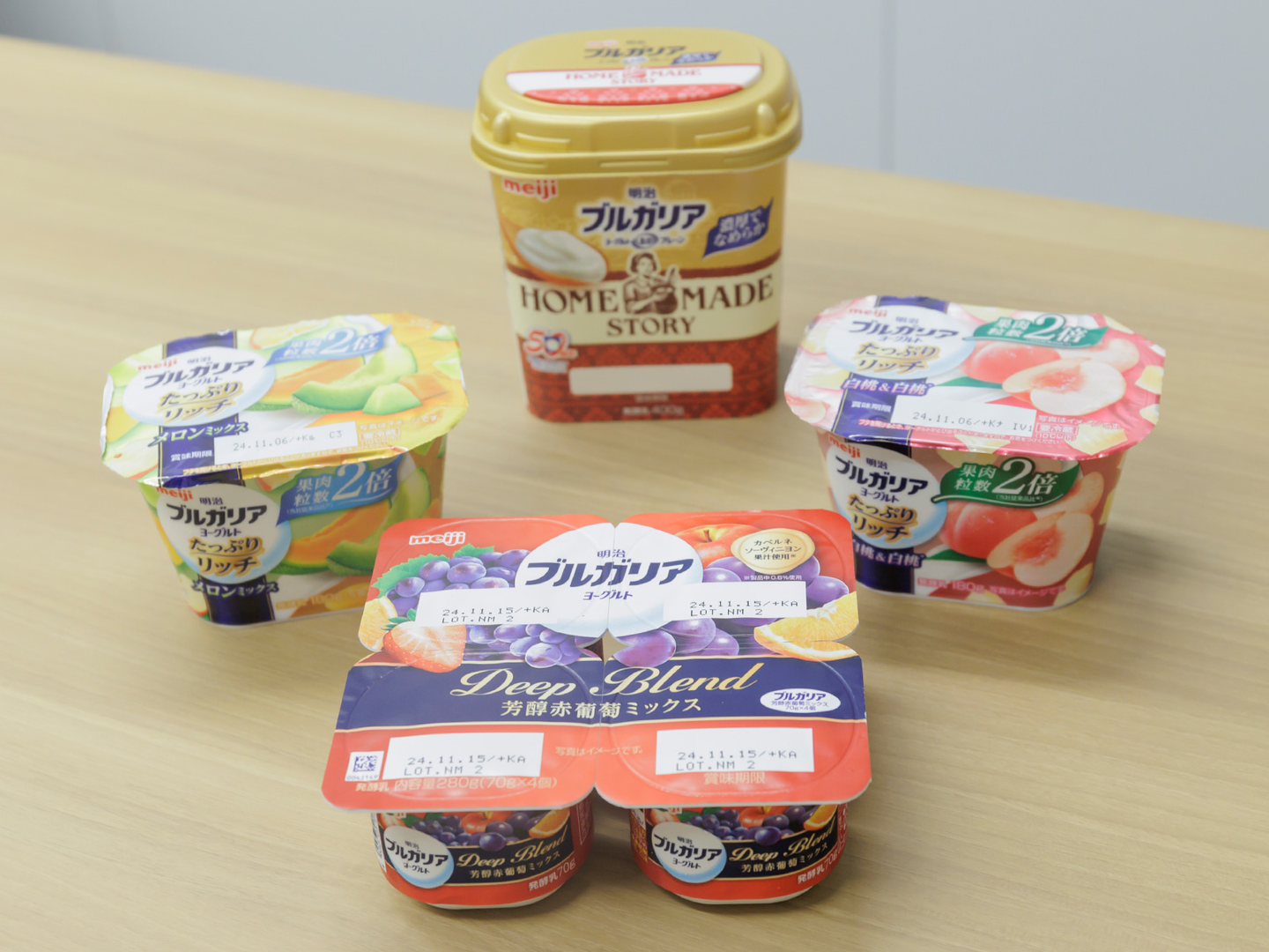 「明治ブルガリアヨーグルト」ブランドのラインナップの一部。手前から、2024年4月に発売されたフルーツの奥深い味わいが楽しめる「Deep Blend」、果肉の食感や風味にこだわった「たっぷりリッチ」、ヨーグルトの本場ブルガリアの家庭に伝統として受け継がれる濃厚さが味わえる「HOME MADE STORY」