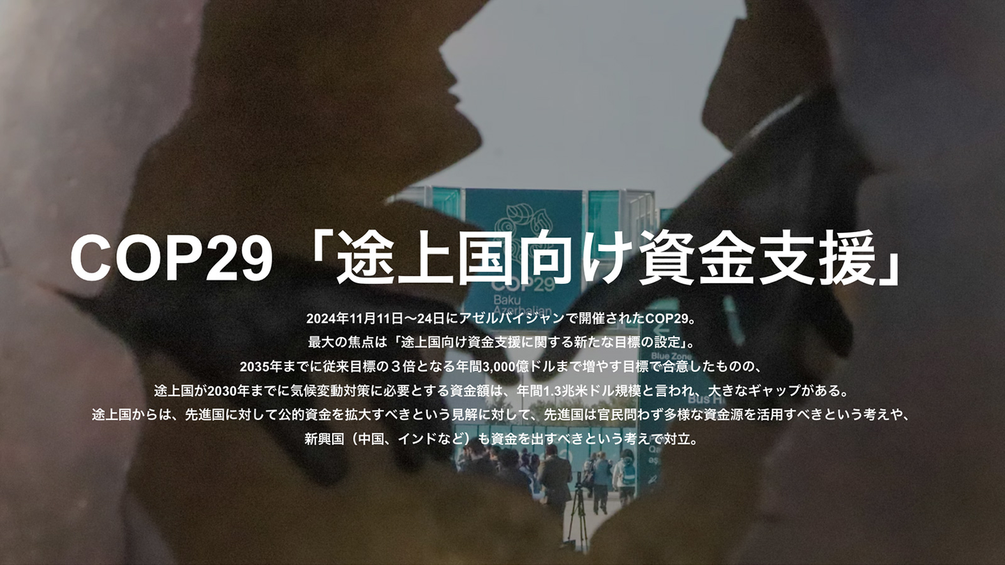 2024年、アゼルバイジャンで開催されたCOP29の最大の焦点は「途上国向け資金支援に関する新たな目標の設定」でした。2035年までに年間3,000億ドルに増やす目標で合意しましたが、途上国が2030年までに必要とする額は年間1.3兆米ドル規模。この大きなギャップに対して、途上国からは先進国に公的資金の拡大を求める一方で、先進国は官民問わず多様な資金源を活用すべきと主張するなど、途上国と先進国の間で対立が生まれています。