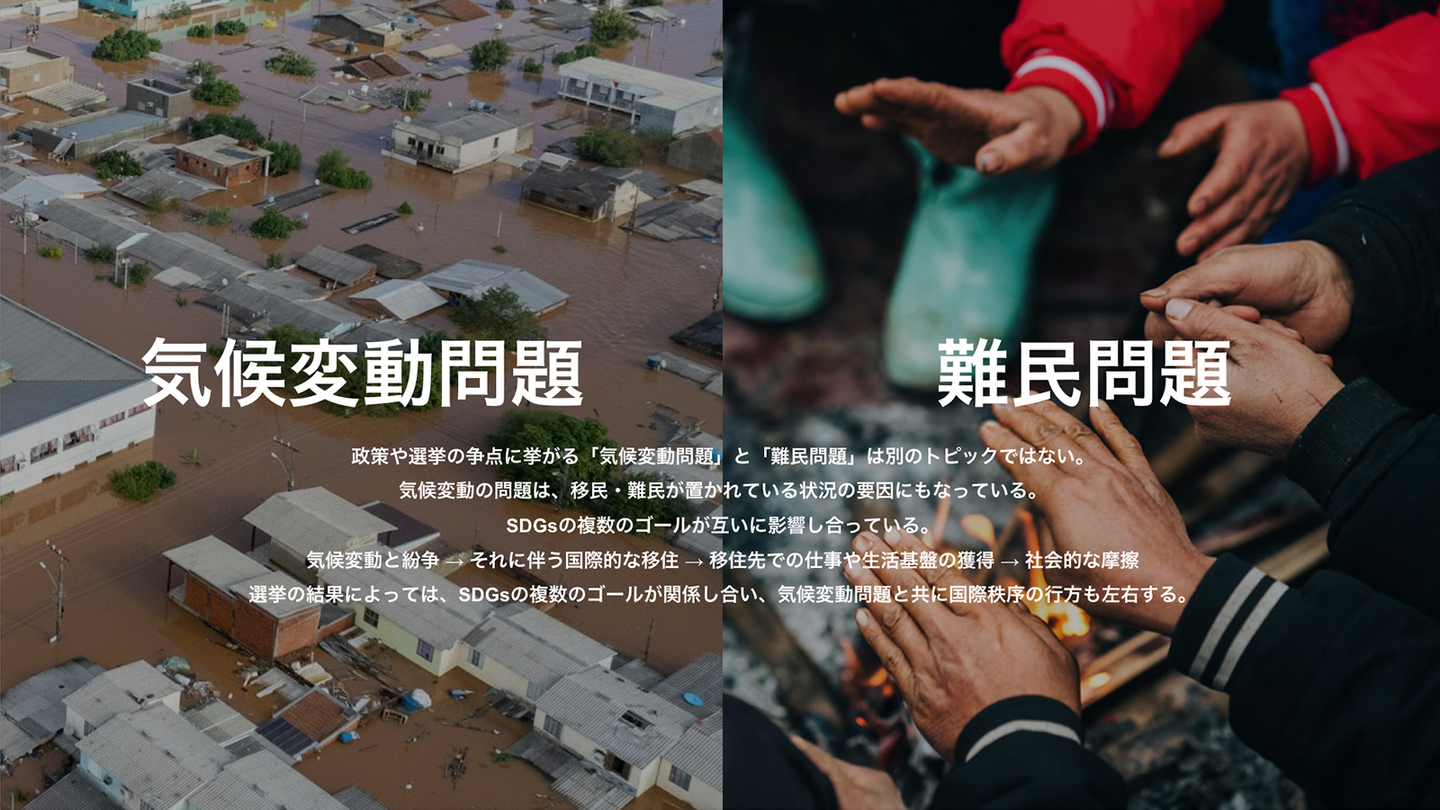 選挙の争点に挙がる「気候変動問題」と「難民問題」は、SDGs(持続可能な開発目標)のゴールでもありますが、別々の問題ではありません。気候変動と紛争によって国を追われた難民が、移住先での仕事や生活基盤を確保していった結果、その国での社会的な摩擦が起きてしまう…。「反グローバリゼーション」や「反移民」といった政策と「気候変動問題」は、本来つながりを持って捉えていくことが必要だということです。
