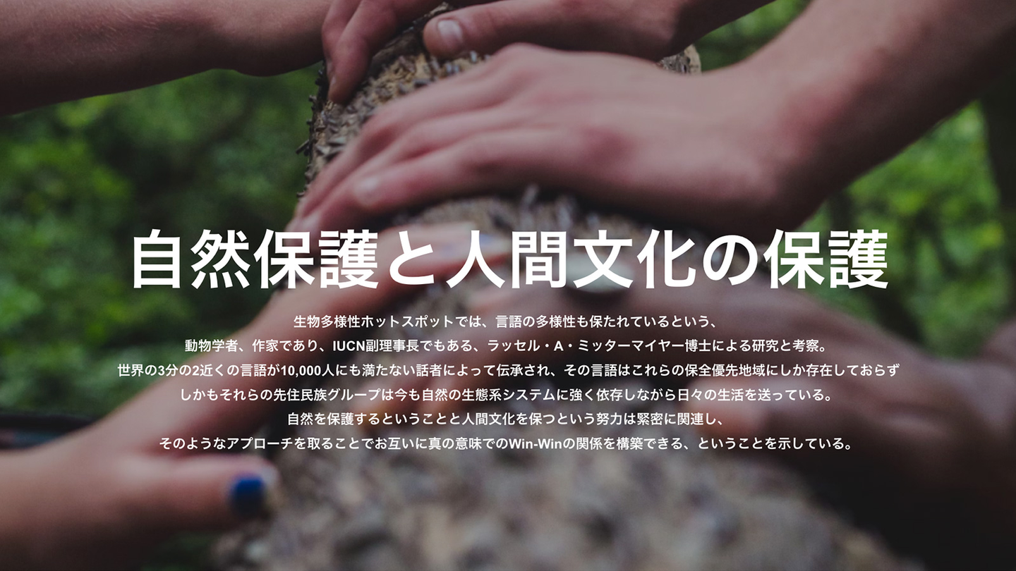 先程、ブラジルの話の中で、大切な資源だけでなく文化も守るという話をしましたが、ここでも興味深い研究結果を紹介したいと思います。「生物多様性ホットスポット※1」は、人間の言語の多様性も保たれているというものです※2。現在、世界の3分の2近くの言語が話者1万人未満の人々によって維持され、その多くがこれらの保全優先地域に集中し、話者である先住民族は自然の生態系に依存した生活を送っています。つまり、自然を保護することは、人間の文化を守ることでもあるという考え方です。