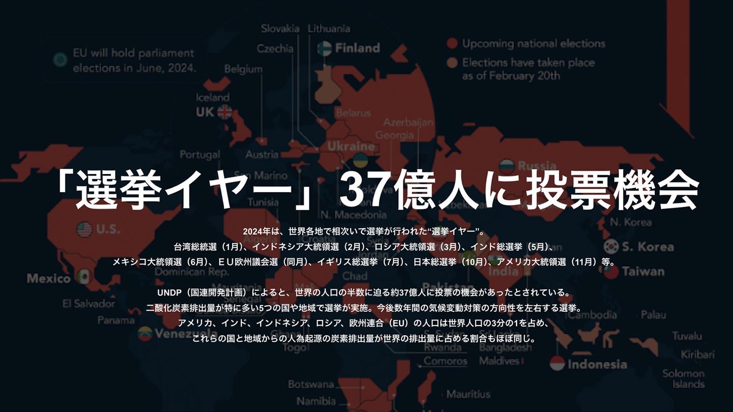 2024年は “選挙イヤー” でもありました。1月の台湾での総統選に始まり、インドネシア、ロシア、インド、メキシコ、EU、イギリス、日本、そしてアメリカ…と、世界各地で選挙が行われ、約37億人に投票の機会があったとされています。これは、世界人口の半数に近い数字です。