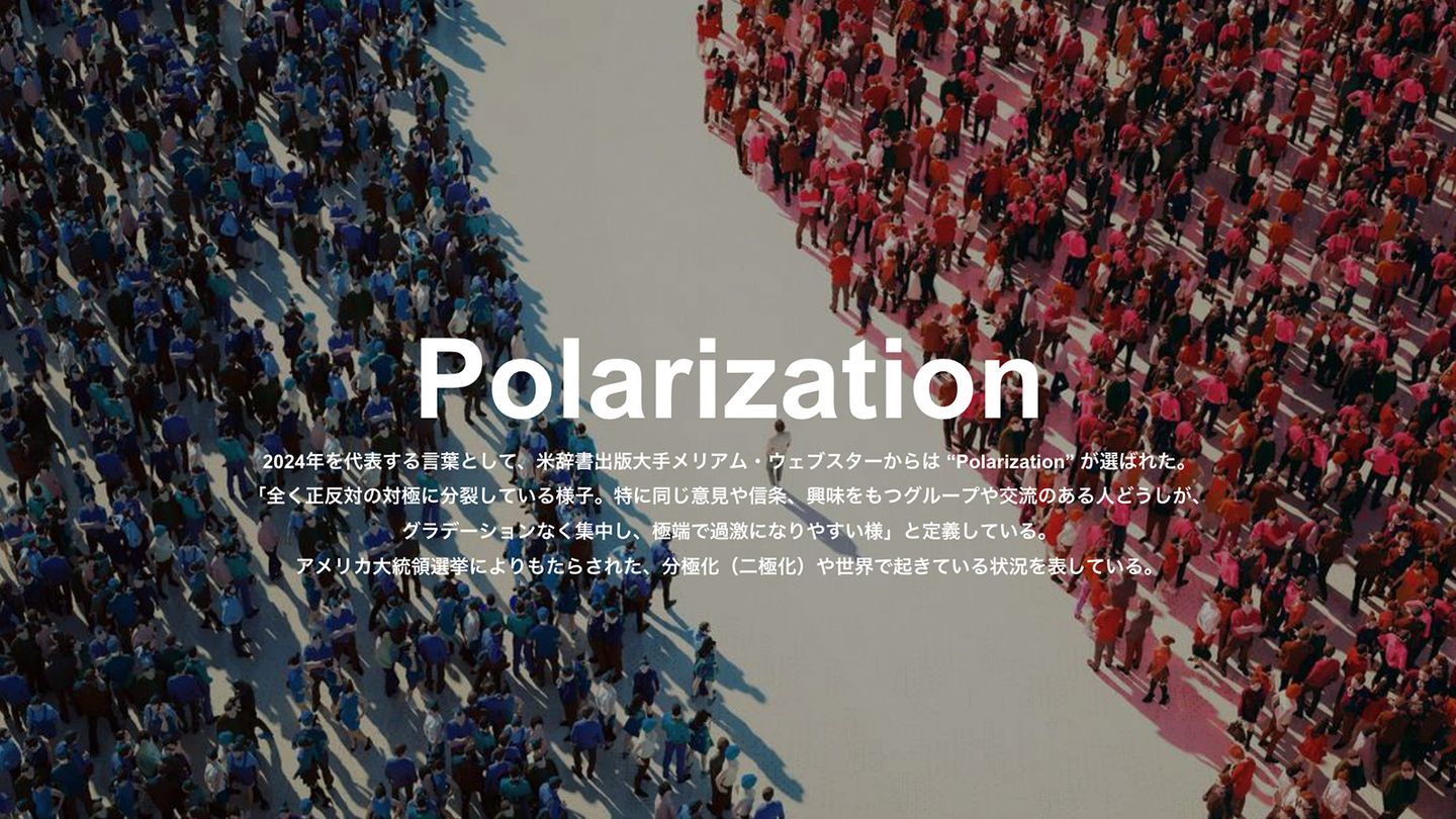 昨年のスピーチで紹介した、2023年を代表する言葉は “Authentic”(「真の」「本物の」「正真正銘の」)でした。2024年を代表する言葉として、アメリカの辞書出版大手メリアム・ウェブスターが発表したのは “Polarization”。アメリカ大統領選挙によって引き起こされた分極化(二極化)や世界情勢を反映し、「全く正反対の極に分裂している状態。同じ意見や信条、興味を持つグループや交流のある人同士が、グラデーションなく集中し、極端で過激になりやすい状態」という意味の言葉が選ばれました。