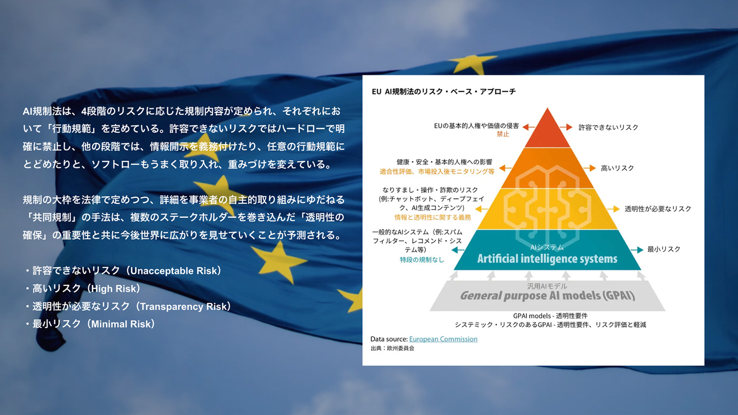 AI規制法の注目すべきは、リスクを4段階に分類し、許容できないリスクはハードロー(強制力のある法律)で禁止し、それ以外は情報開示の義務や任意の行動規範を定めるソフトロー(柔軟な規制)を導入している点です。また、規制の大枠を法律で定める一方、詳細は企業や業界にゆだねる「共同規制」の手法を採用しています。このアプローチは、世界や日本にも広がっていくことが予想されます。