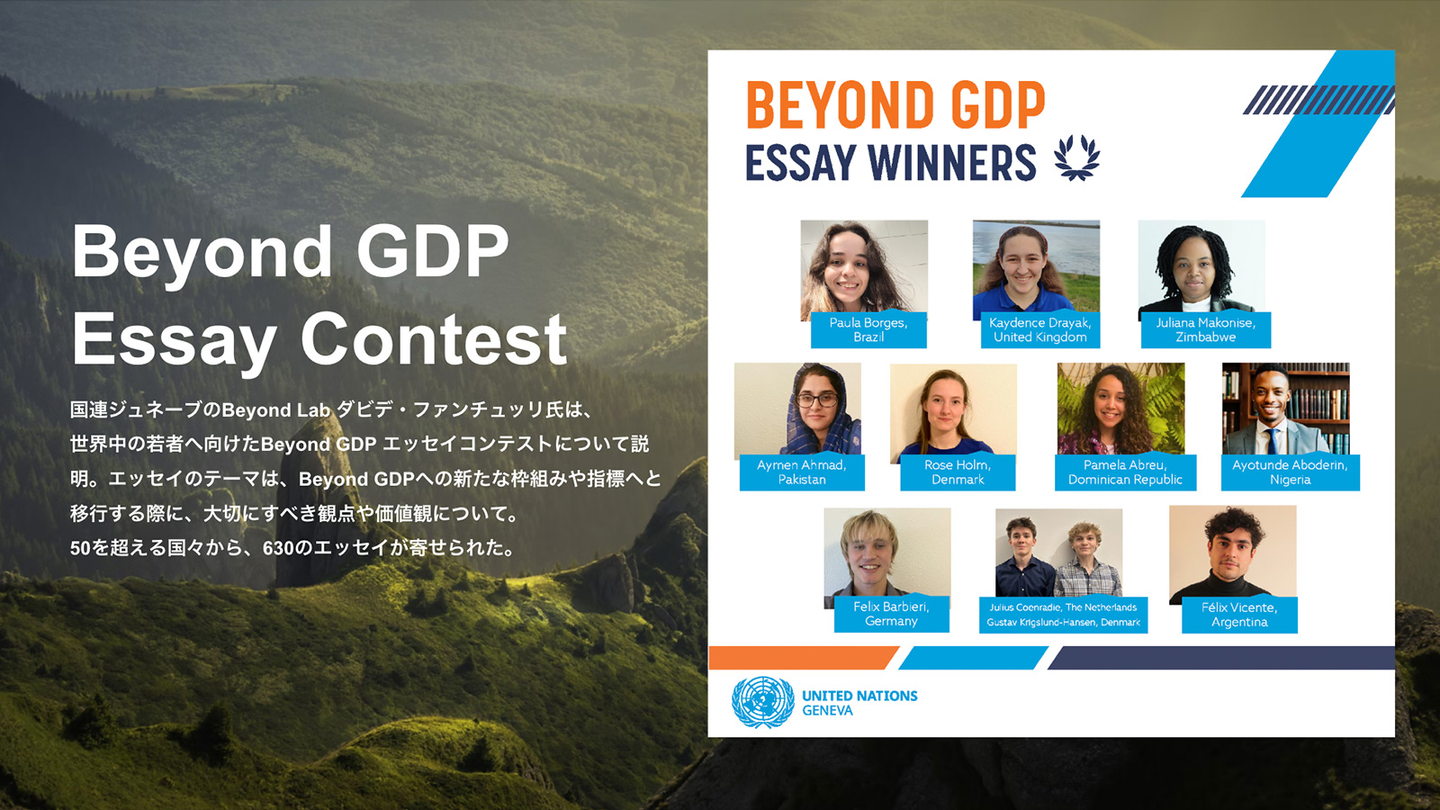 そんな違和感を探るために、情報に触れている中で出会ったのが、世界中の若者を対象に国連ジュネーブが開催した「Beyond GDPエッセイコンテスト」です。まさにエッセイのテーマは、「Beyond GDPへの新たな枠組みや指標への移行において、大切にすべき観点や価値観」について。選ばれたエッセイの中でも、特に伝えたい2つのエッセイをみんなに紹介したいと思います。