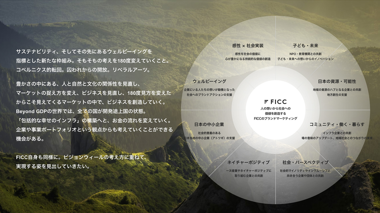 みんなが生み出した資源と機会をもとに、ビジネスとして捉えていく社会テーマをまとめたFICCの「ビジョンウィール」。この「ビジョンウィール」に重ねながら、向き合うブランドの事業ポートフォリオや活動をパーパスの観点から見つめ、新たな市場の中で持続可能なビジネスを創造し、お金の流れを変えていくために、どのような機会や可能性があるかを探求していく存在でありたい ——。私たちFICCは、ブランドの力になる役割があるからこそ、ブランドに関わる人たちと共に、この大きなテーマに向き合い、体現していくことができる一年になるように。