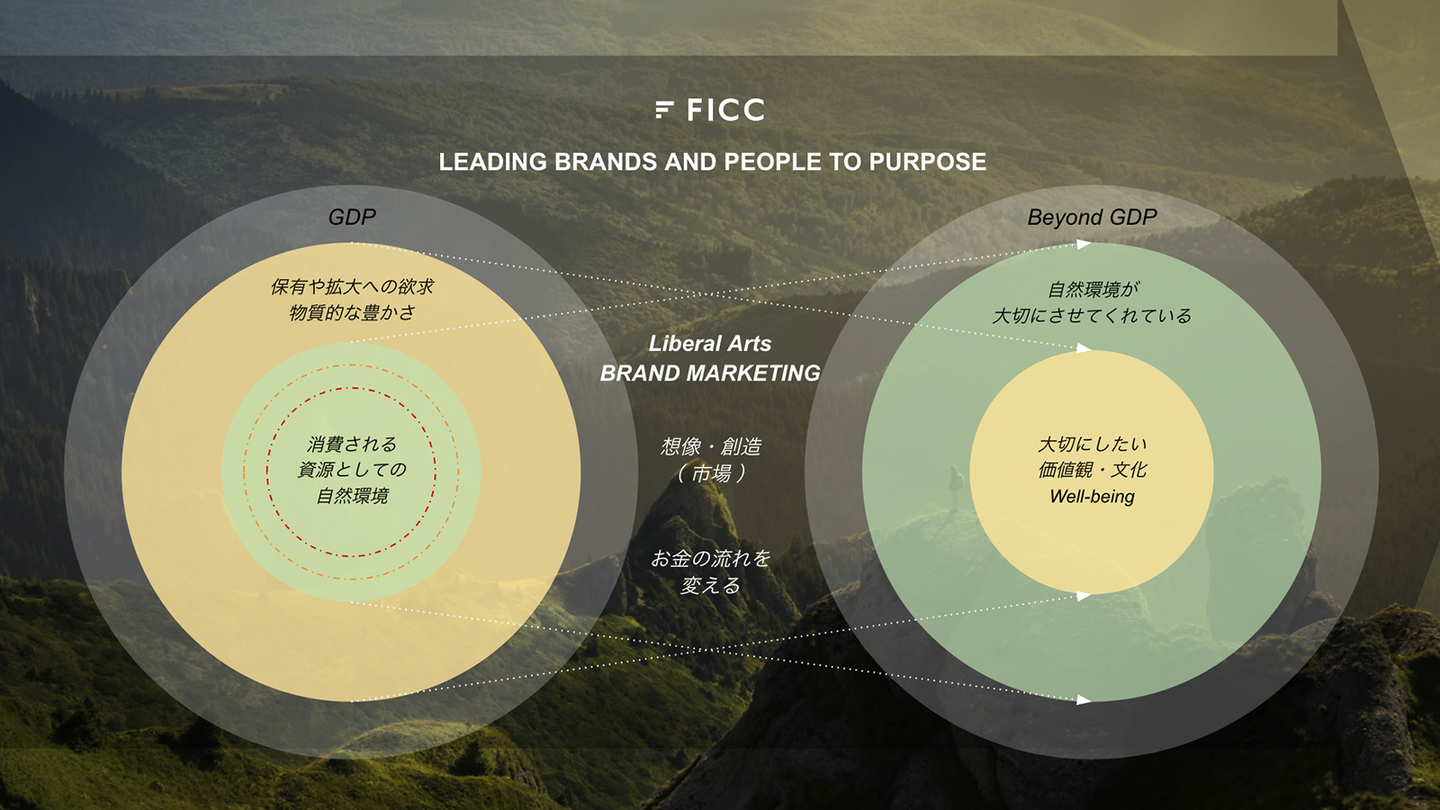 Beyond GDPにおいては、すべての国が発展途上にあります。新たな持続可能な経済価値のフレームを構築し、お金の流れを変えていくこと。その実現には、企業がボトムアップの視点から考え、積極的にアクションしていける機会があると思っています。FICCはブランドに向き合う立場だからこそ、世界の動きを深く理解し、リベラルアーツの哲学を大切に問いを立て、ボトムアップで貢献していく存在でありたい。