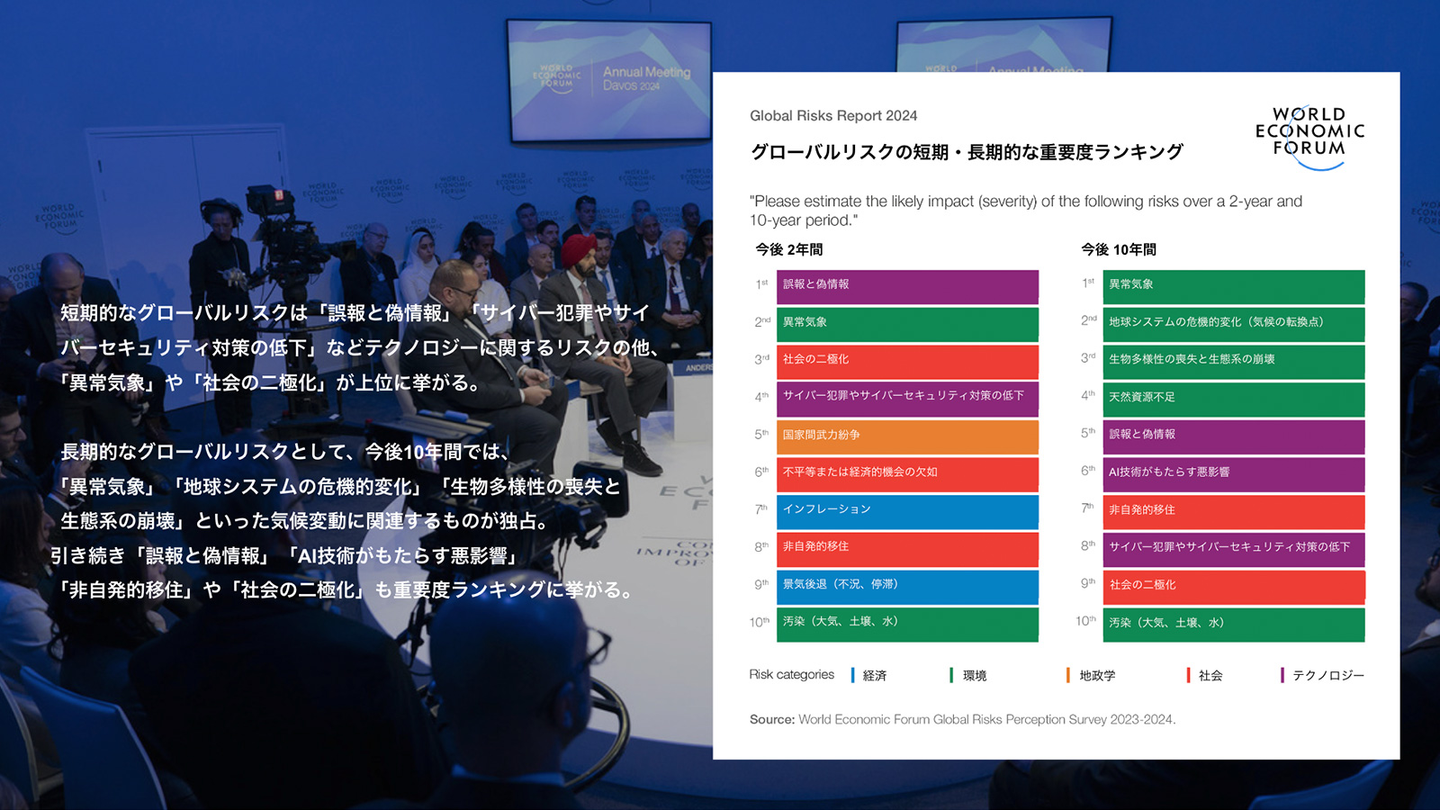 「信頼の再構築」というテーマだった2024年の世界経済フォーラム。同フォーラムが発表した「グローバルリスク報告書」では、現在世界が直面している最大のリスクとして「異常気象」「偽情報」「社会の二極化」を挙げています。今後2年間のグローバルリスクとしては「誤報と偽情報」が「異常気象」を抜いてトップとなっています。