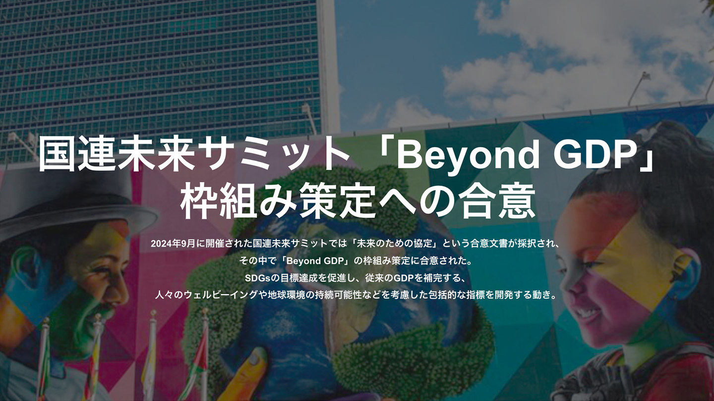 2024年の国連未来サミットにて「Beyond GDP」の枠組みを策定していくことが合意され、SDGsの目標達成の促進だけでなく、人々のウェルビーイングや地球環境の持続可能性などを考慮した「指標」の開発がこれから期待されています。