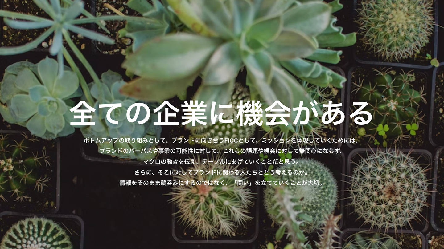 この年始スピーチを、みんなの想いやブランドに関わる人たちの想いと共に、社会価値と経済価値の両立を実現する力に変えていく。機会は必ずあります。その機会を自ら想像し創造するのが、私も含め、FICCメンバーであると信じています。