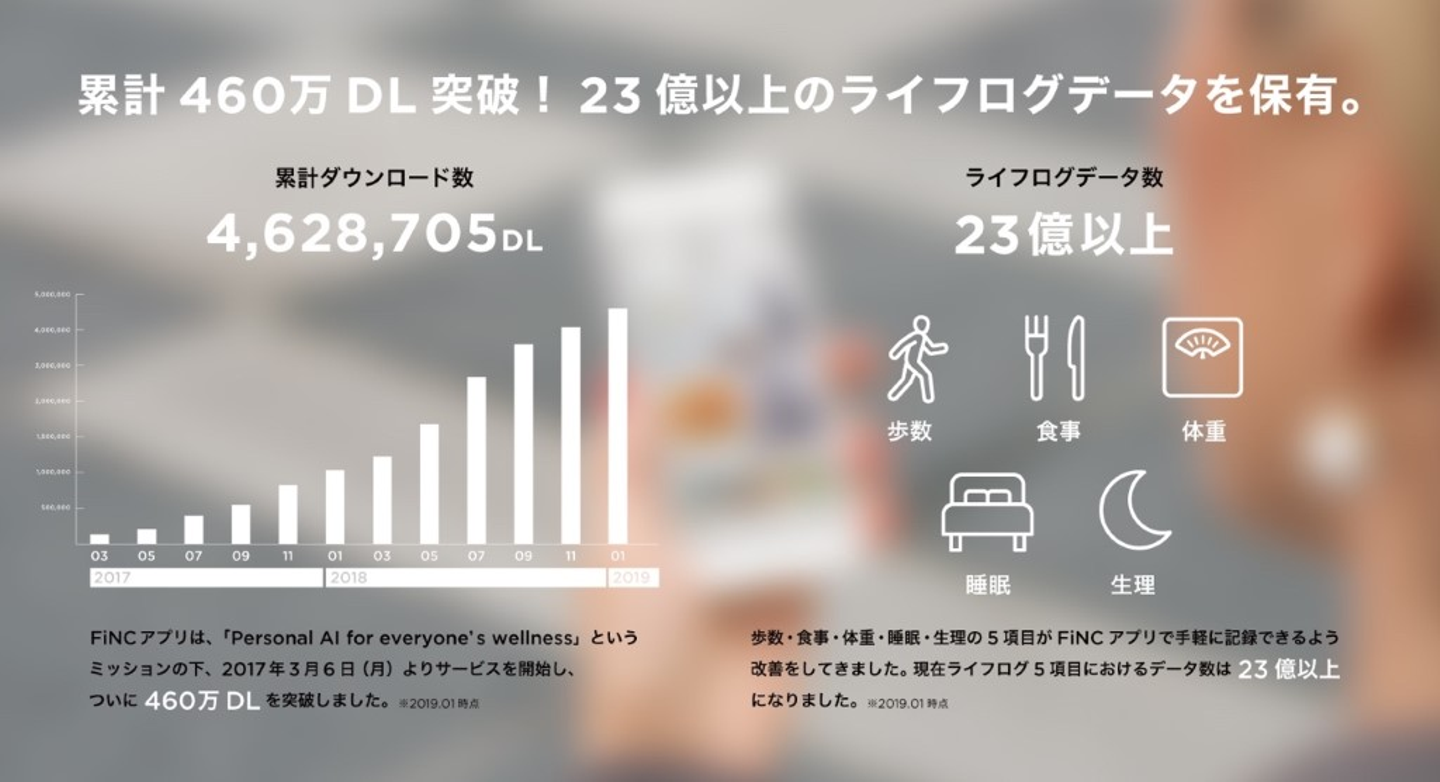 南野:はい。次にユーザー数です。2018年1月でFiNCアプリはDL460万以上、ライフログデータ数は23億以上まで到達しました。