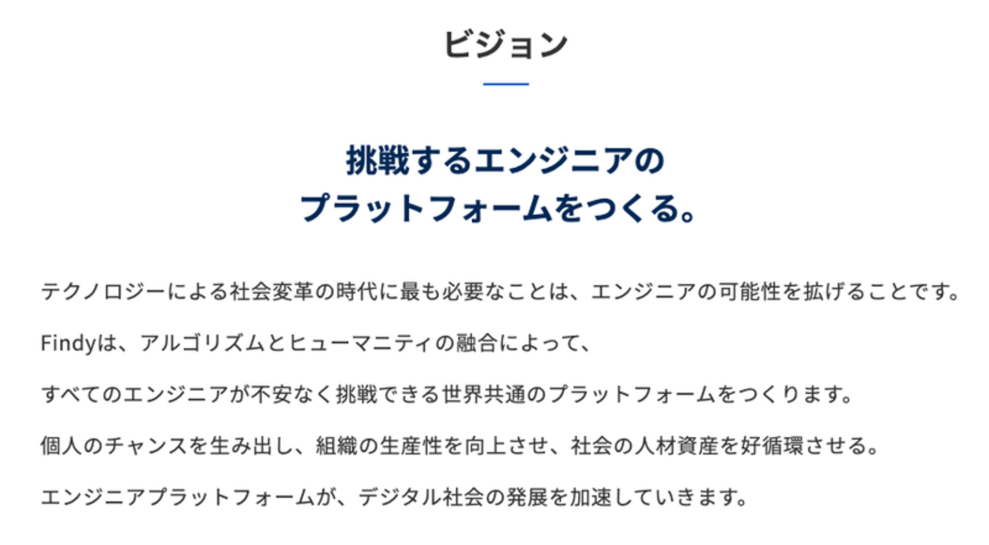 Findyは「挑戦するエンジニアのプラットフォームをつくる。」というビジョンを掲げています)。