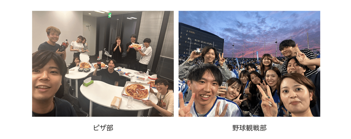 例えば、受注が決まった時や、採用で内定承諾をいただいた時には、「おめでとう!」「やったね!」という声がオフィス中飛び交い、挨拶や笑い声が常に響き渡ります。また、週に1回全メンバーが集まるコミュニケーションを目的にした、"昼会"では、新メンバーが自己紹介をしたり、メンバーのFinTに勤続している年数をそれぞれお祝いしたり...。それ以外にも、2部署以上、合計5名以上の参加で認められる"部活"では、オフィスでピザパーティーをしたり、仕事帰りにみんなで野球観戦に行ったりと、さまざまな時間を共に過ごしています。