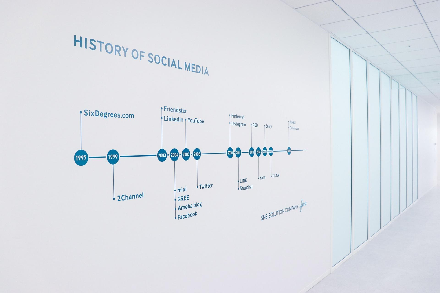機械的な年表をインテリアとして違和感なく取り入れることを心がけました。ネイビーカラーの円と線で構成されたシンプルなデザインは、オフィスの白い空間に馴染みながらも、来社された方々の目に留めていただけると思います。私自身も今後のSNSの変遷に目を向けて、この先もアップデートしていきたいです!