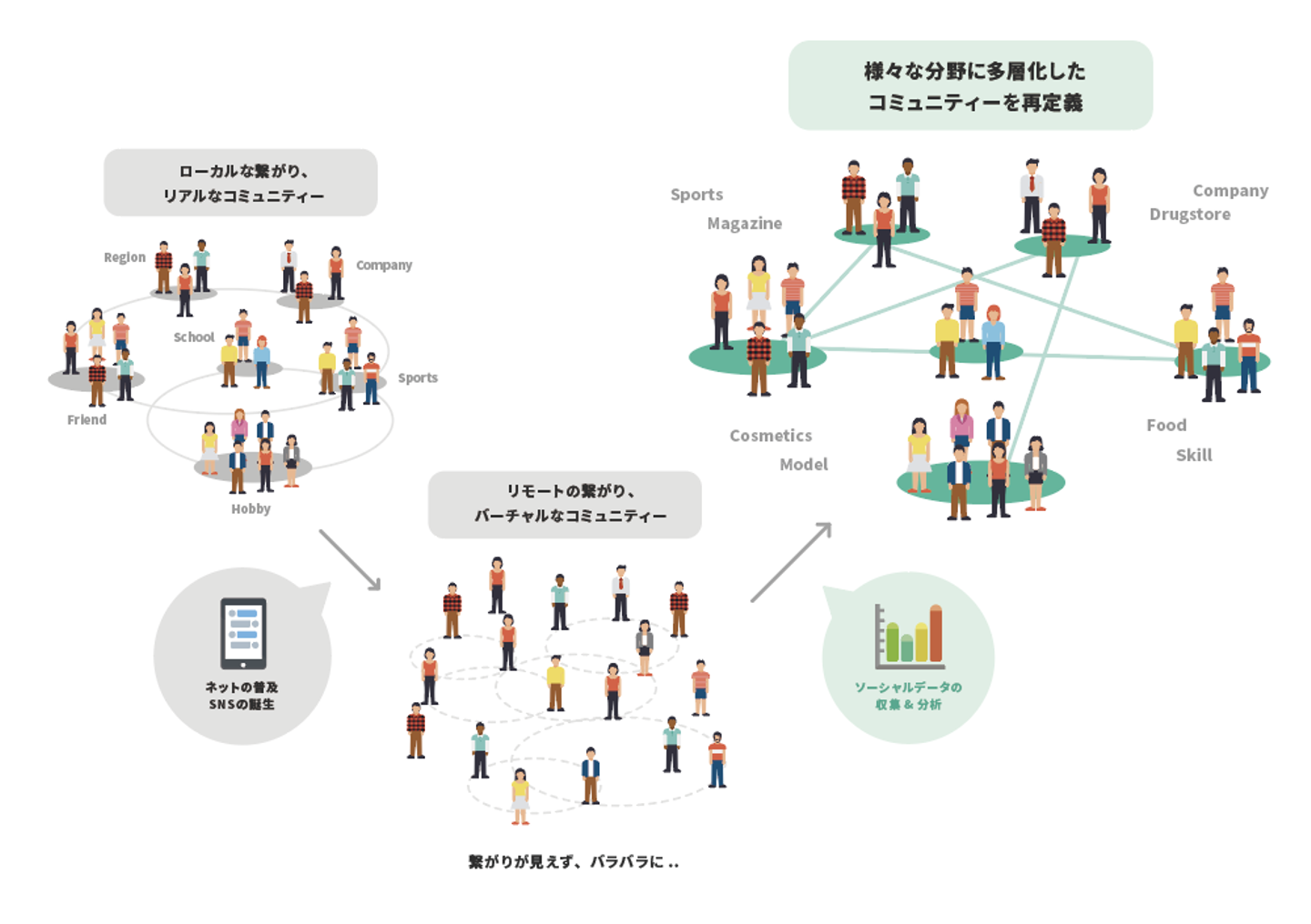 しかし、インターネットの普及によって、リアルだけでなくインターネット上にもコミュニティができるようになりましたよね。SNSが登場し、住んでいる地域はバラバラでもバーチャル上でコミュニティが形成されるようになりました。