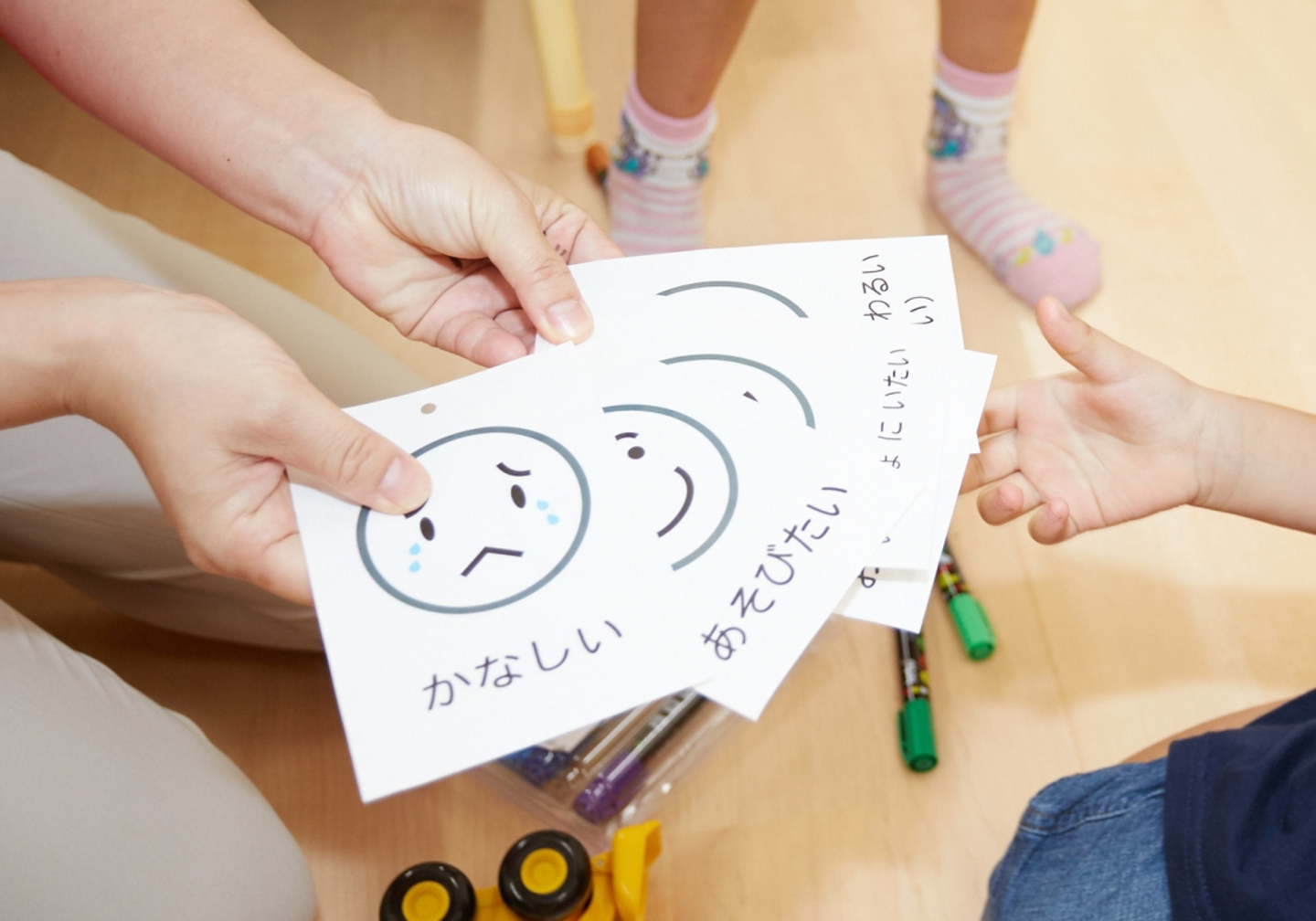 園児は登園するとまず、その日の気持を「感情カード」で表現します。「みらい」は自分だけのものではありません。「みんなのみらい」をつくるためには、まず自分の気持ちを知り、それが相手とは違うと気づくことが必要です。「みんなのみらい」のために一人ひとりの「違い」を大切にできるよう感情カードを使って学びます。