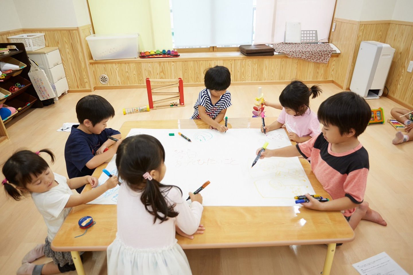 「みんなのみらいをつくる保育園」では、子どもの主体性を大切にします。「今日やりたい遊びは?」「遠足はどこに行く?」など子どもたちだけで話し合い、自分たちで「みらい」を決めることを学びます。保育者は質問のシャワーによって、そんな子ども達の意見を引き出すファシリテーターです。