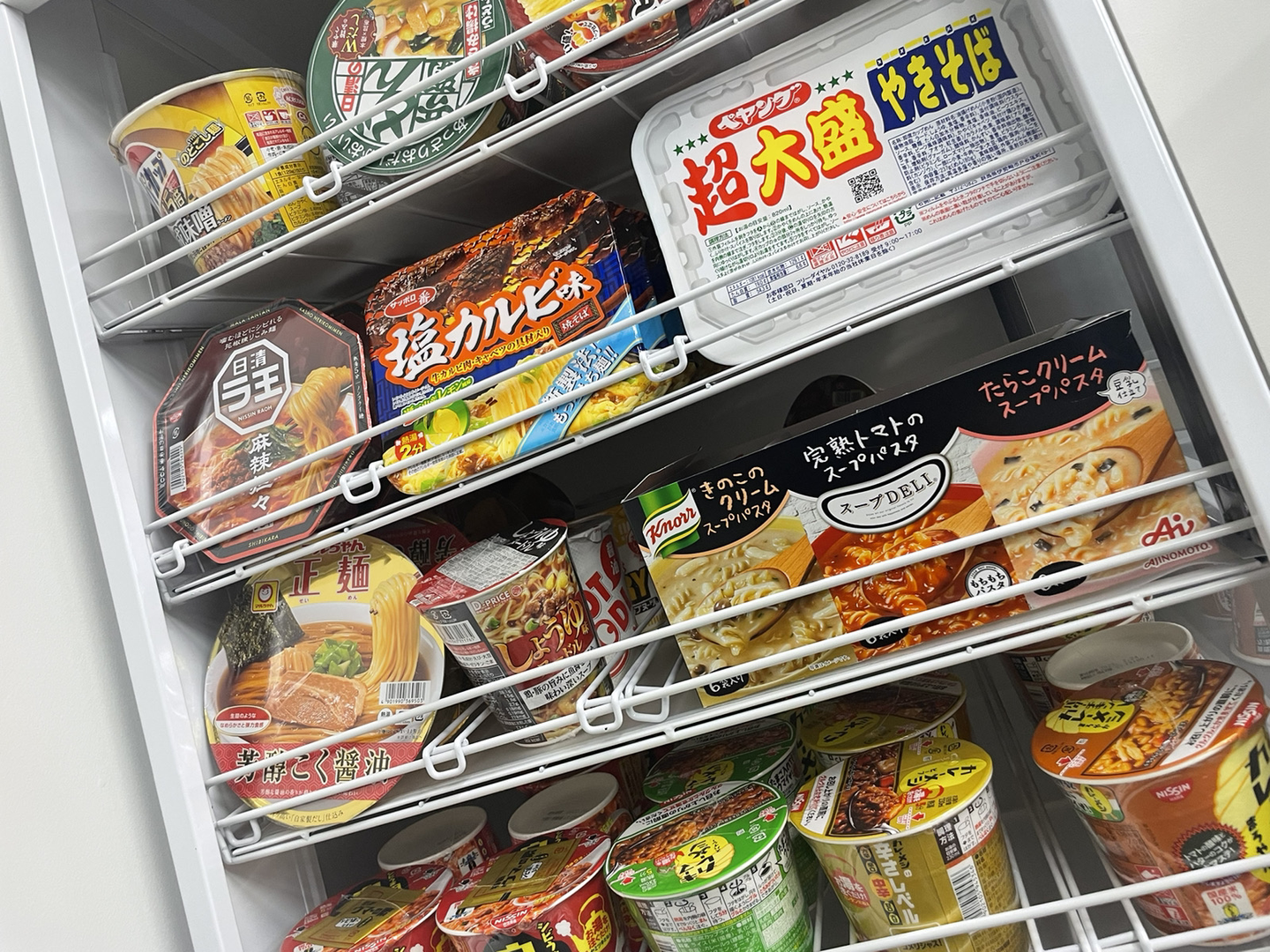 カップ麺やドリンクが常備されていて、無料で利用できるので