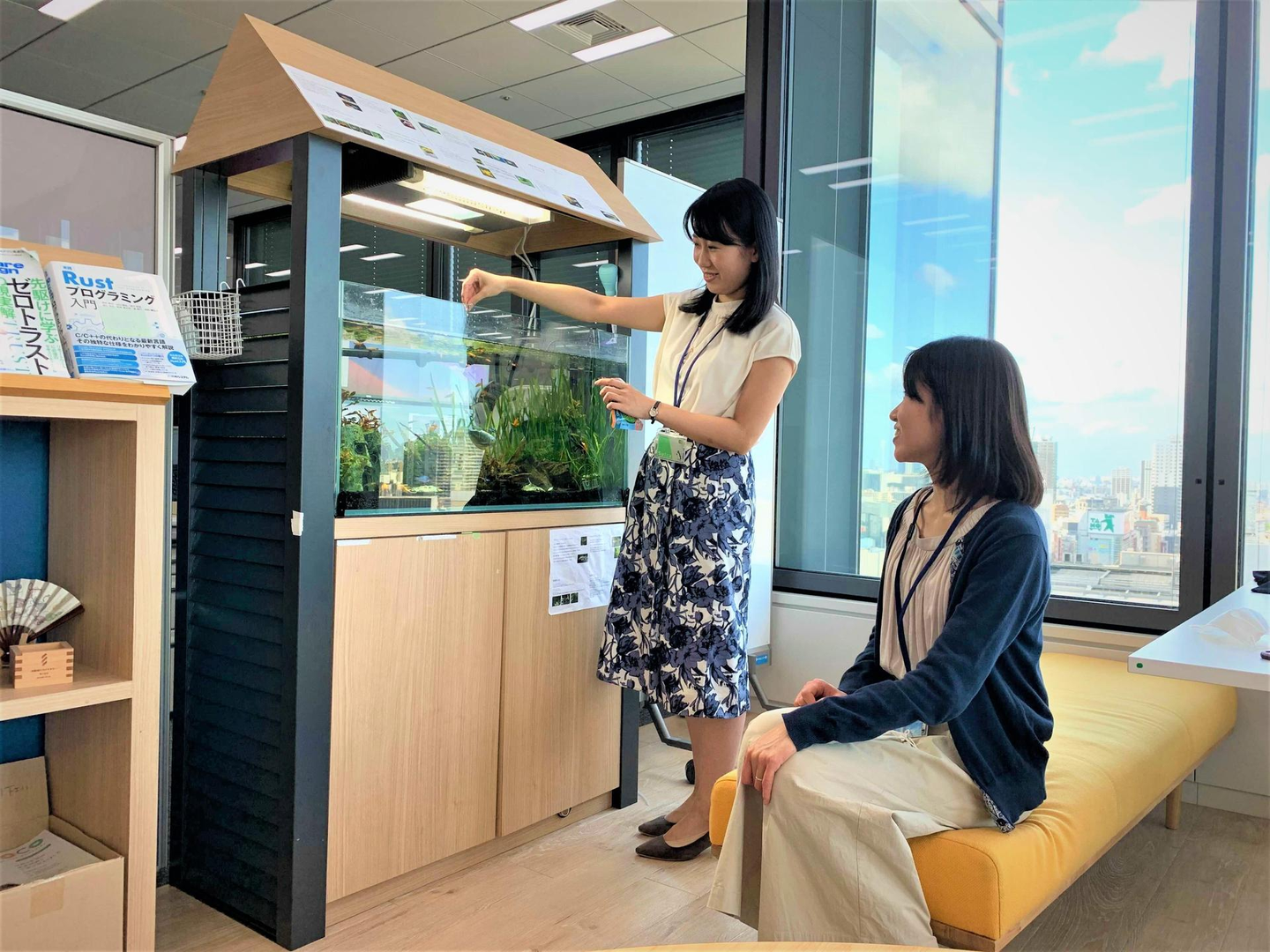 倉田:全然違います!執務スペースに休憩コーナーや植物があるなんて驚きです。前職のデスク周りは人の座席以外にも、種々の端末、本や書類用スペースが多かったのですが、フォルシアでは顔を上げれば向こうの窓、社長の席まで見渡せる、開放感がありますよね。植物だけでなく、水槽まで自分たちで管理しているなんて...