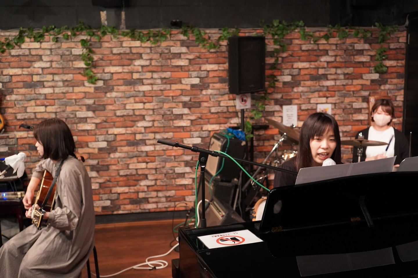 最初はトリオでの演奏でした。ピアノの音から始まるアンジェラ・アキの代表曲です。ピアノの弾き語りを生で見たのは学校の音楽の授業以来だったかも知れません。yoshinari氏のピアノの弾き語り、takashima氏のリズミカルなドラム、takeshita氏のギターとコーラスで、きれいに織り重なった三重奏でした。グループでの併せての演奏は、さぞかし大変だったと思います。ただ、その綺麗に重なった音の迫力で、1曲目から観客のテンションはぶちあがることになったのです。