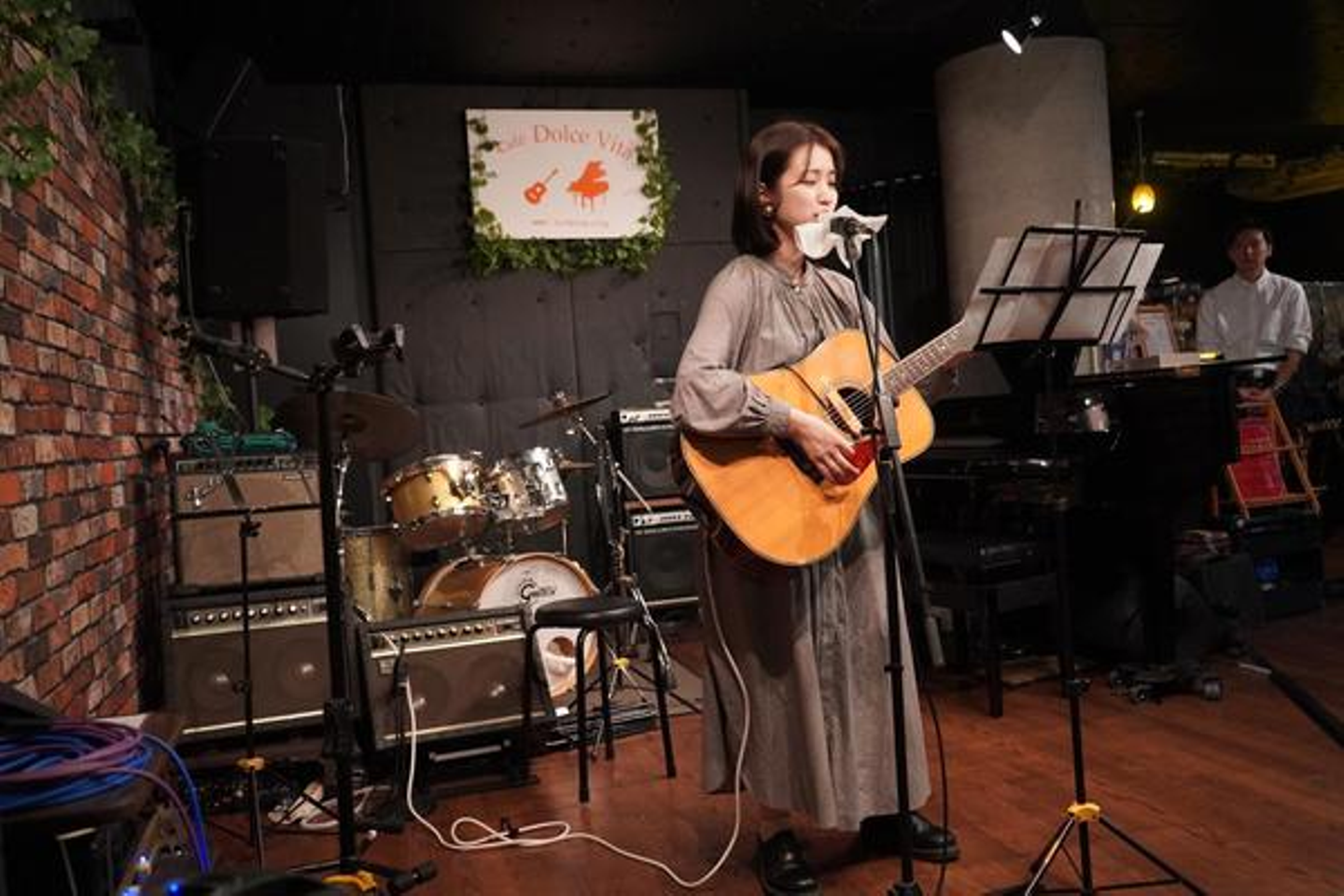 ギターを持ってスタンディングで歌い始めたのはtakeshita氏。その佇まいは、この曲のキャラクターにぴったりであり、歌声もこの曲調にぴったりだと感じる、甘さと強さを兼ね備えたものでした。甘さも苦さも時間をかけて味になる。人生をスープに見立てたその歌詞が、とても染み入りました。