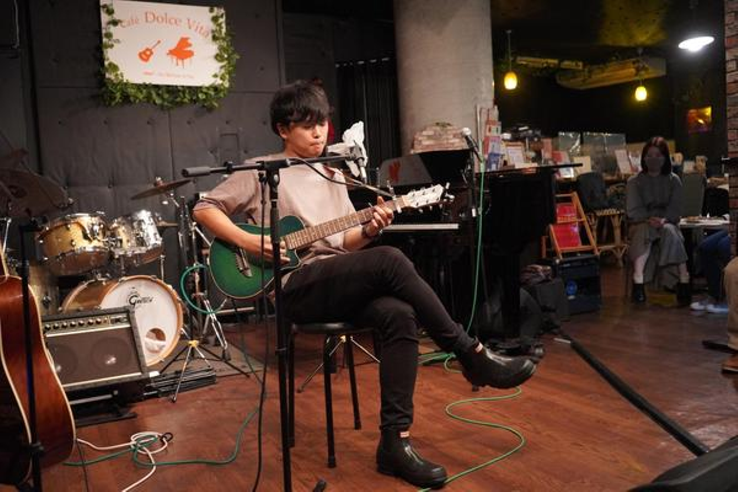 続いては、エレキギター一本で弾き語りのterunuma氏。カラオケで歌えない、自分で歌いたい歌を持ってきた、と弾き出したのは「ハヌマーン」。今回のステージで聞くまで、知らない歌でしたが、そのロックな演奏とその歌声に一瞬で引き込まれました。間奏であるギターソロの部分も、時に激しく、時に丁寧に演奏をし会場を盛り上げてくれ「猿の学生」「アパルトの恋人たち」の2曲を披露してくれました。