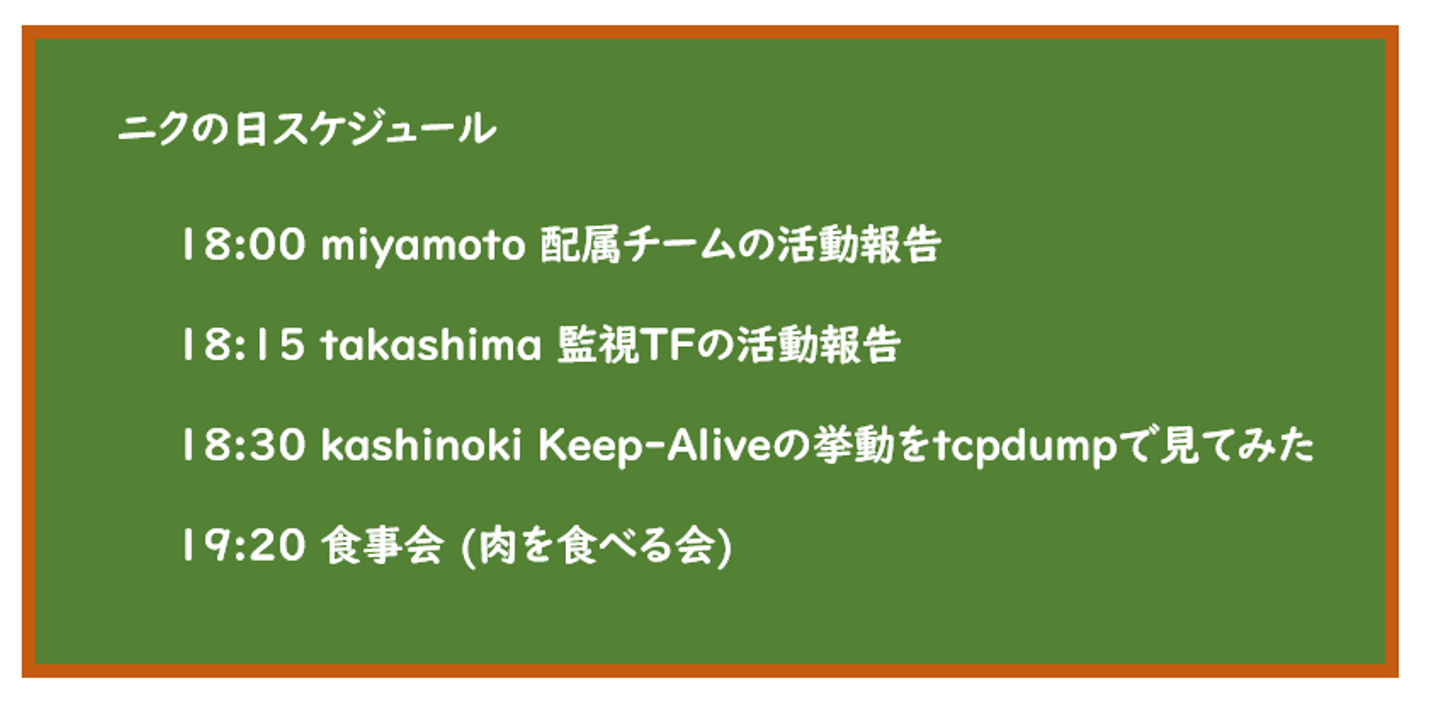 スローガンを決めた一方、イベントの具体的な中身は運営メンバーの裁量に任せることにしました。例えば、3月はオフィスの外で焼肉、4月のニクの日は発表を聞きながらお弁当、という感じです。社内の状況が常に変化する中でベストな方法はその時の運営が考えるのがよいだろうという考えからです。
