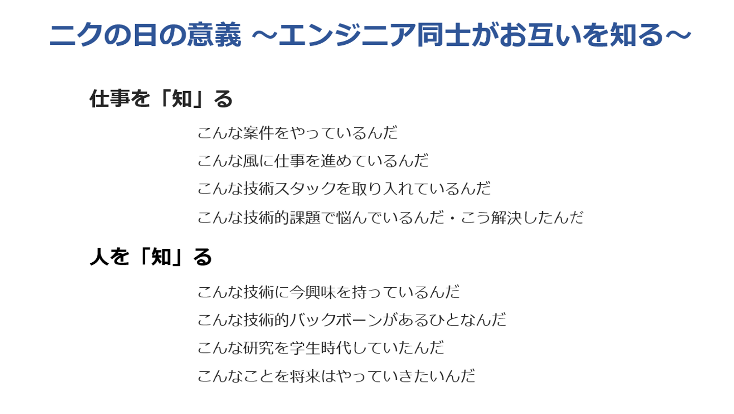 開催の意義を明確にするため、 エンジニア同士がお互いを知る というスローガンを設けました。