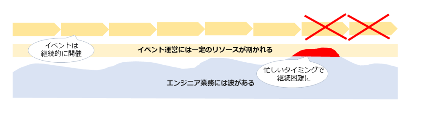 過去の技術イベントでは、主体となる1名~3名が普段のエンジニア業務のかたわらで運営を行っていました。単発イベントであれば少数精鋭で行うのが効率的ですが、継続的なイベントとなると一定のリソースを運営に割き続けなければなりません。これではメンバーのエンジニア業務が忙しくなったタイミングでイベントが続けられなくなるリスクがあります。