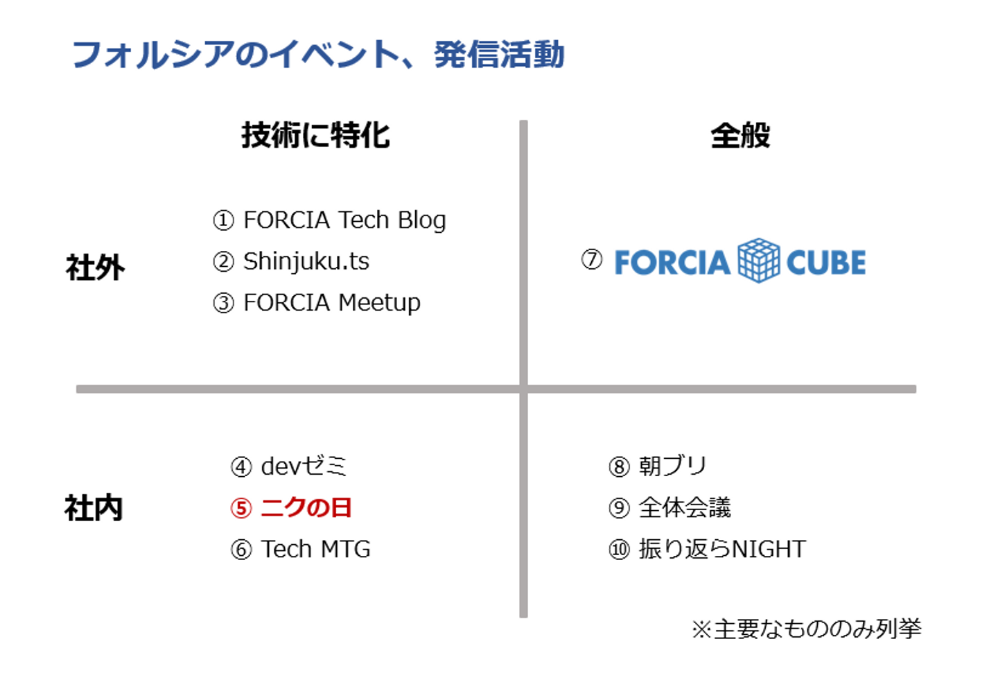 フォルシアでは様々な技術イベントを開催していますが、大きく分けると社外向けのイベントと社内向けのイベントがあります。社外向けのイベントでは知見の広い共有につとめる一方、社内向けのイベントでは業務に直結した深い議論を行っています。この記事では社内向けの技術イベントの1つである ニクの日 について紹介します。