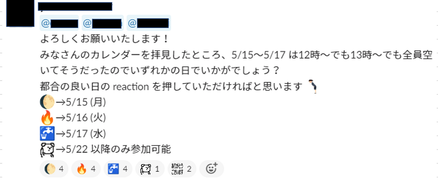 - 日程調整はbotで行わず、グループごとで行うコミュニケーションの一環として!