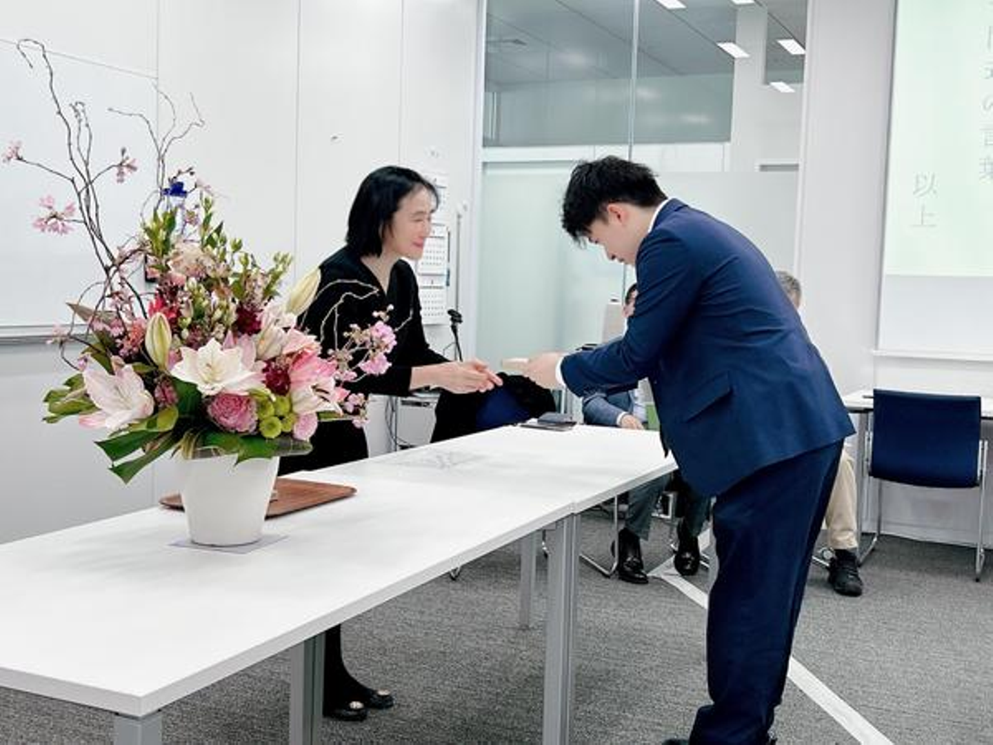 サークル活動などで名刺をつくられるケースもありますが、社会人としての初めての名刺。一人ずつ名前を呼ばれ、名刺を受け取りにいく姿にはまだまだぎこちなさも。これからこの名刺とともに経験・成長を重ねていく姿が楽しみです。
