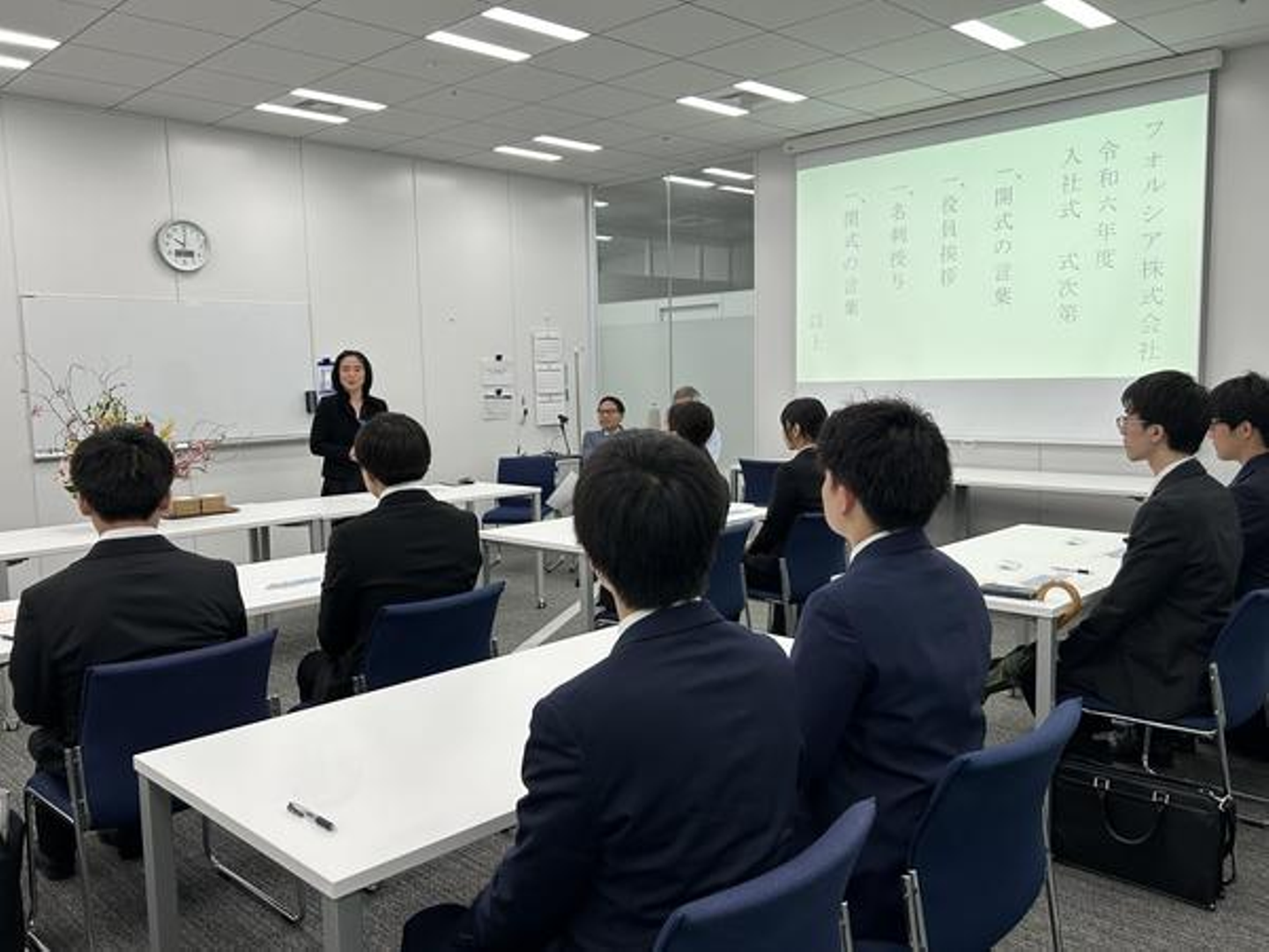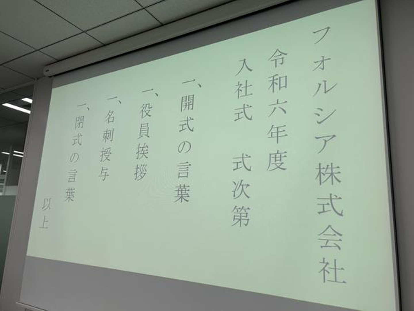 フォルシアの入社式は毎年社屋の会議室で執り行われます。役員からのメッセージと名刺授与というシンプルな式典ですが、新入社員にとっては人生で一度きりの大切な場。まだ着慣れないスーツ姿の背中からは緊張感が伝わってきますが、役員それぞれのあたたかいメッセージに、今日からの社会人生活への期待が膨らんでいるように感じました。