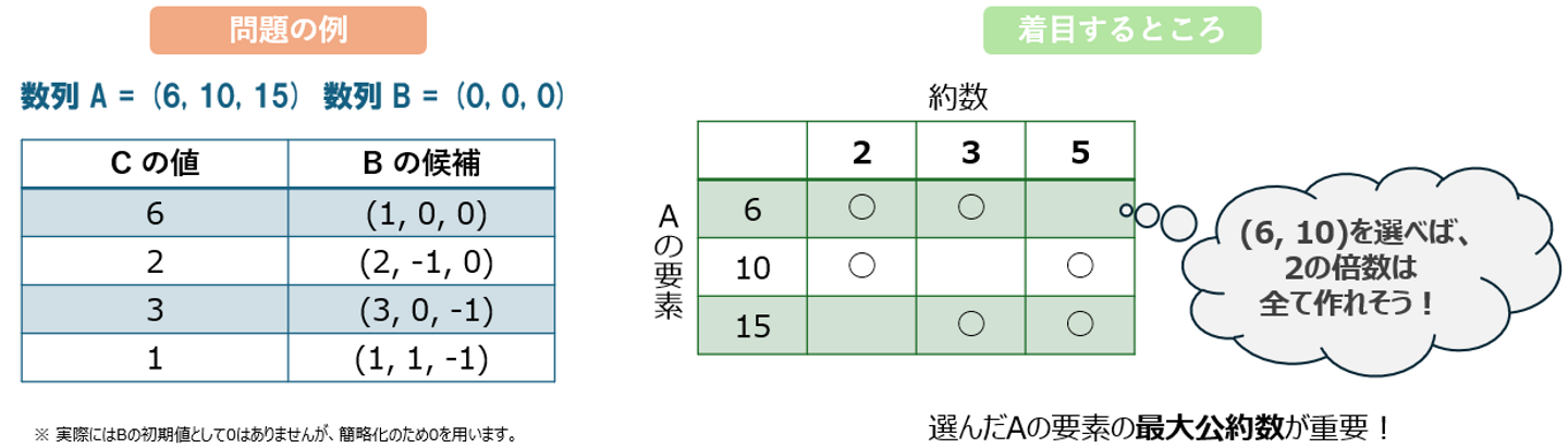 問題の概要は「数列AとBの要素ごとの積の総和がCとなるよう、Bの値を変えてください。ただし変えるBの要素の個数は最小化してください。」というものです。以下の問題の例も参考にしてみてください。