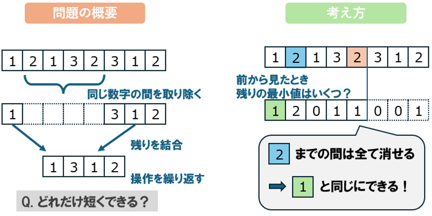 巨大なサンドイッチの中から小さいサンドイッチをつまんでいくような問題です。原案当初は「各数字がそれぞれちょうど2回ずつ現れる」という制約でしたが、別の競プロ部メンバーの「同じ数字は何度でも出てきた方が面白い」という意見によりその制約が取り除かれ、問題がアップデートされました。それもあってか、参加者アンケートでも最も評価の高かった問題となりました。